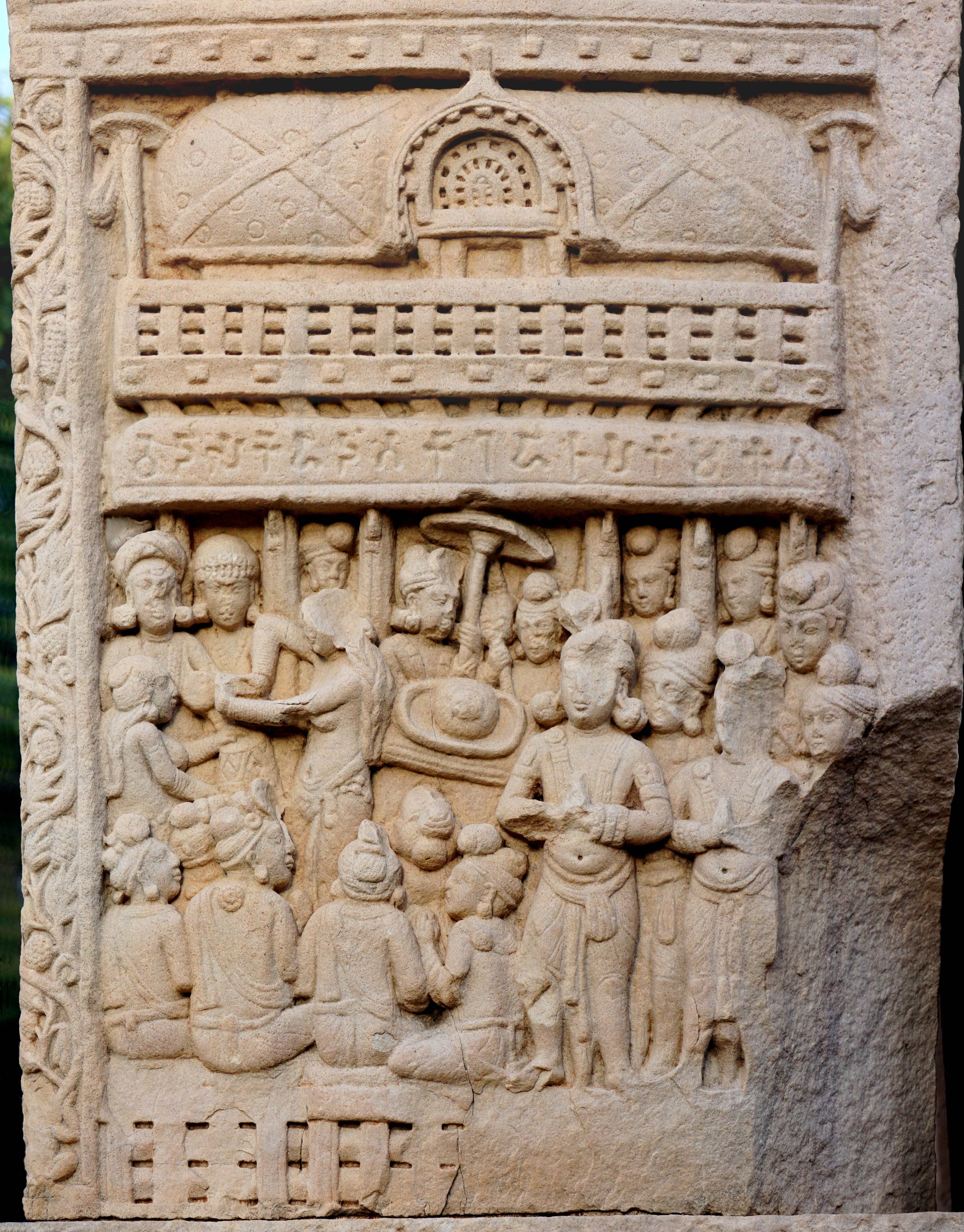 브라흐미 문자로 새겨진 ''시리-사타카르니 비문''은 사타바하나 왕 사타카르니 2세의 장인들이 남쪽 게이트웨이 상단 아치트레이브 중 하나를 기증했음을 기록하고 있다.[41]