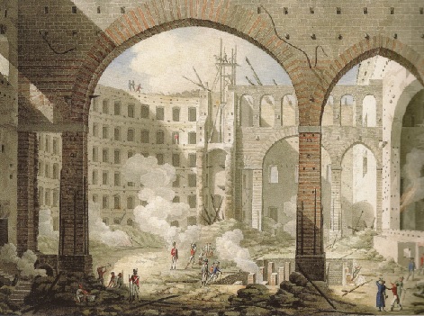 1816년 2월 13일, 발레 공연 리허설 중 발생한 화재로 극장 건물이 소실되었다.[9] 당시 국왕이었던 페르디난도 1세(나폴리 왕으로는 페르디난도 4세, 극장 창설자 카를로 3세의 아들)는 즉시 재건을 명했다.