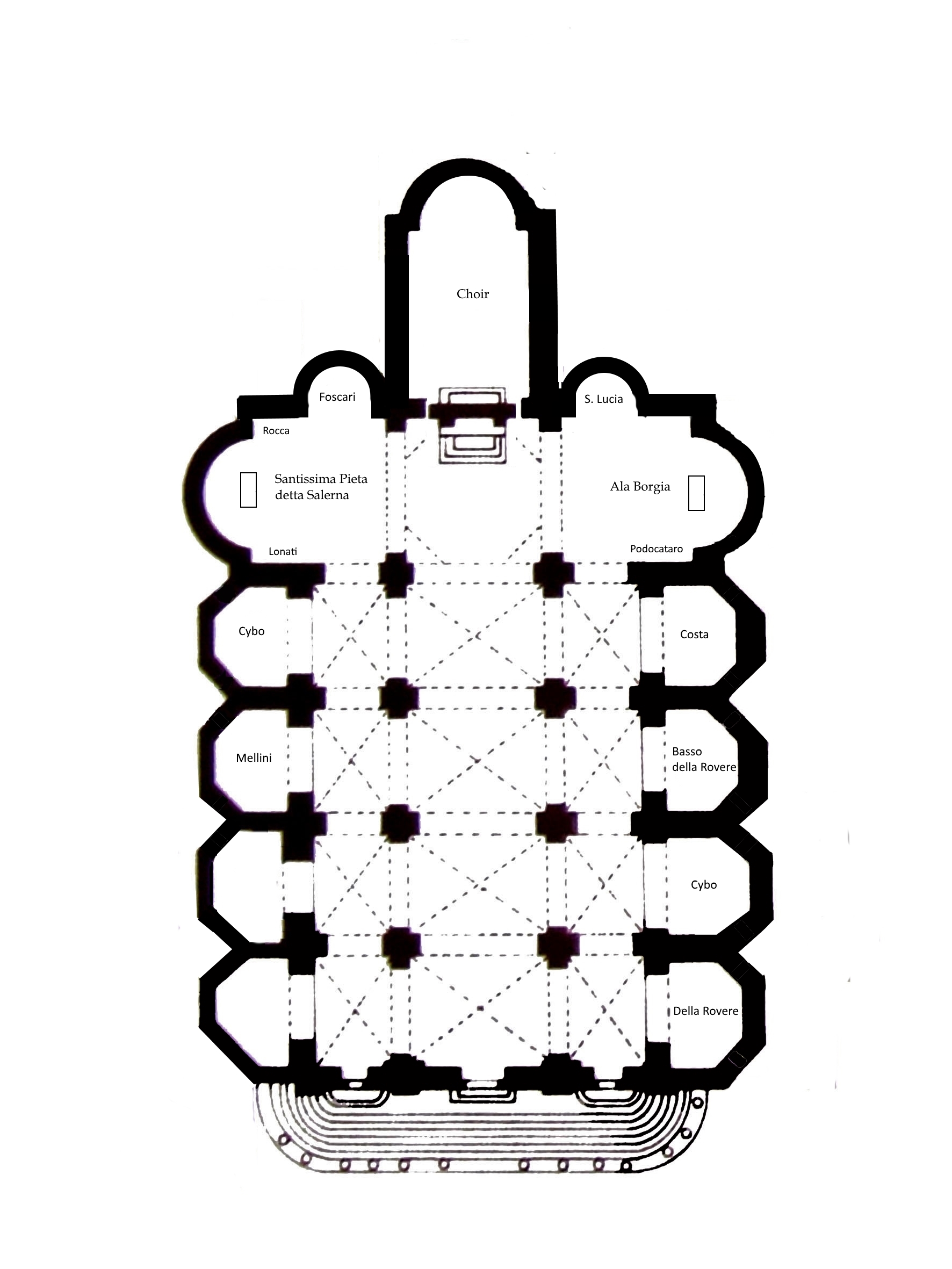코스타 예배당 | 조르제 다 코스타 추기경이 꾸몄으며, 핀투리키오 학파의 루네트화, 잔 크리스토포로 로마노의 제단화 등이 있다. |