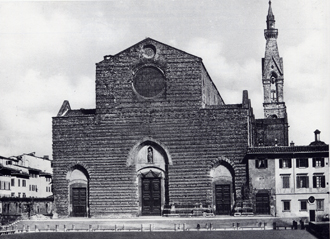 산타 크로체 성당은 8단의 계단으로 기초가 높여져 있다. 원래 파사드는 피렌체의 많은 성당들과 마찬가지로 미완성 상태였으며, 산 로렌초 성당과 유사했다.[15] 15세기에 쿠아라테지 가문이 파사드 건설 자금을 지원하겠다고 제안했지만, 프란체스코회 수도사들이 파사드 중앙에 가문의 문장을 넣는 것을 거부하여 무산되었다.[15]