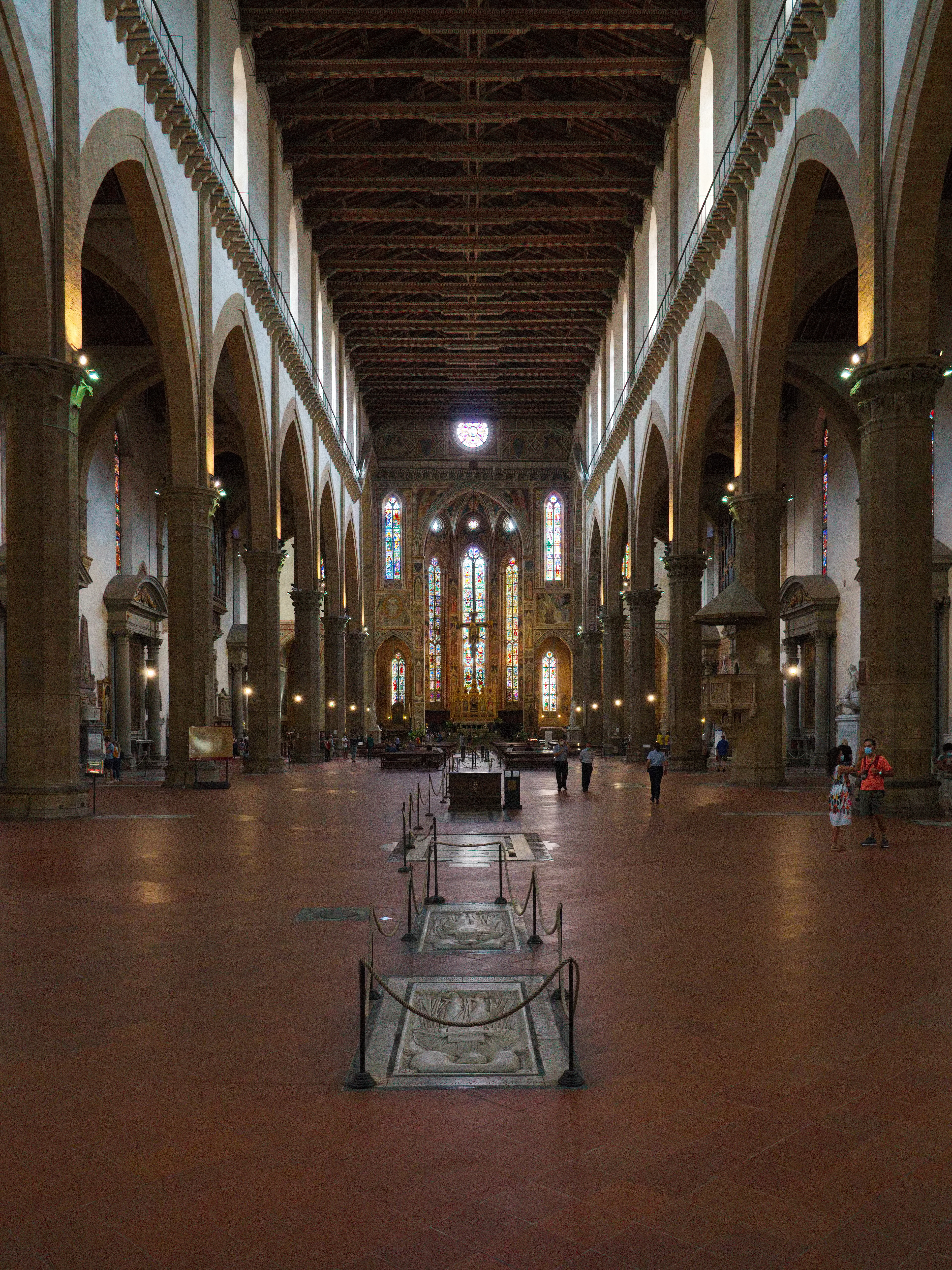 팔각형 기둥열이 늘어선 길이 115m의 삼랑식 본당과 73.54m의 측랑으로 이루어진 T자형 건축 평면으로 구성되어 있다. 원래 5번째 경간부터 측랑을 포함한 주제단까지의 구역은 성직자만 출입이 가능했고, 칸막이에 의해 신자 구역과 분리되어 있었지만, 트리엔트 공의회 이후 토스카나 대공 코시모 1세의 명령에 따라 조르조 바사리의 지휘하에 종교 개혁에 따른 교회 개축이 이루어지는 과정에서 이 칸막이는 철거되었다. 이 개축 공사에서 벽면을 장식하고 있던 14세기 프레스코화는 회반죽으로 덮였고, 대형 제단이 벽면을 따라 설치되었다(최근 재발견된 14세기 프레스코화는 성당 부속 미술관에서 관람 가능하다).