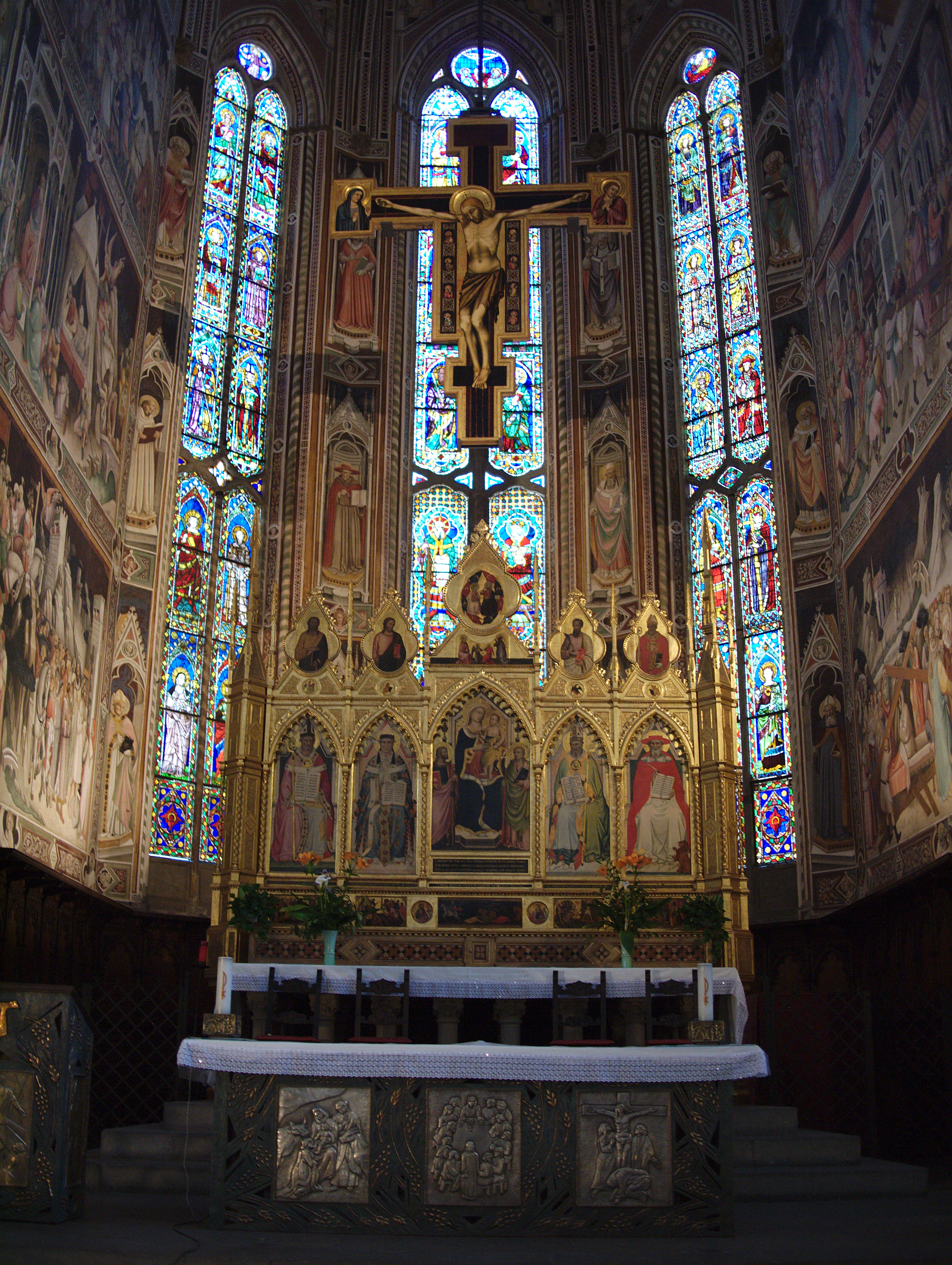 주 제단 중앙에 걸린 십자가는 무명의 「피렌체의 화가」의 작품이다. 다익 제단화는 여러 화가의 협작으로, 중앙 패널의 성모는 니콜로 게리니가, 좌우 패널에 그려진 교회 박사들은 조반니 델 비온도와 무명의 화가가 담당했다.주 제단을 장식하는 프레스코 벽화는 1380년경 아뇰로 가디가 그린 것으로, ≪성십자가의 발견≫을 묘사하고 있으며, 오른쪽 벽면 상부에서 하부로 이야기가 전개된다.