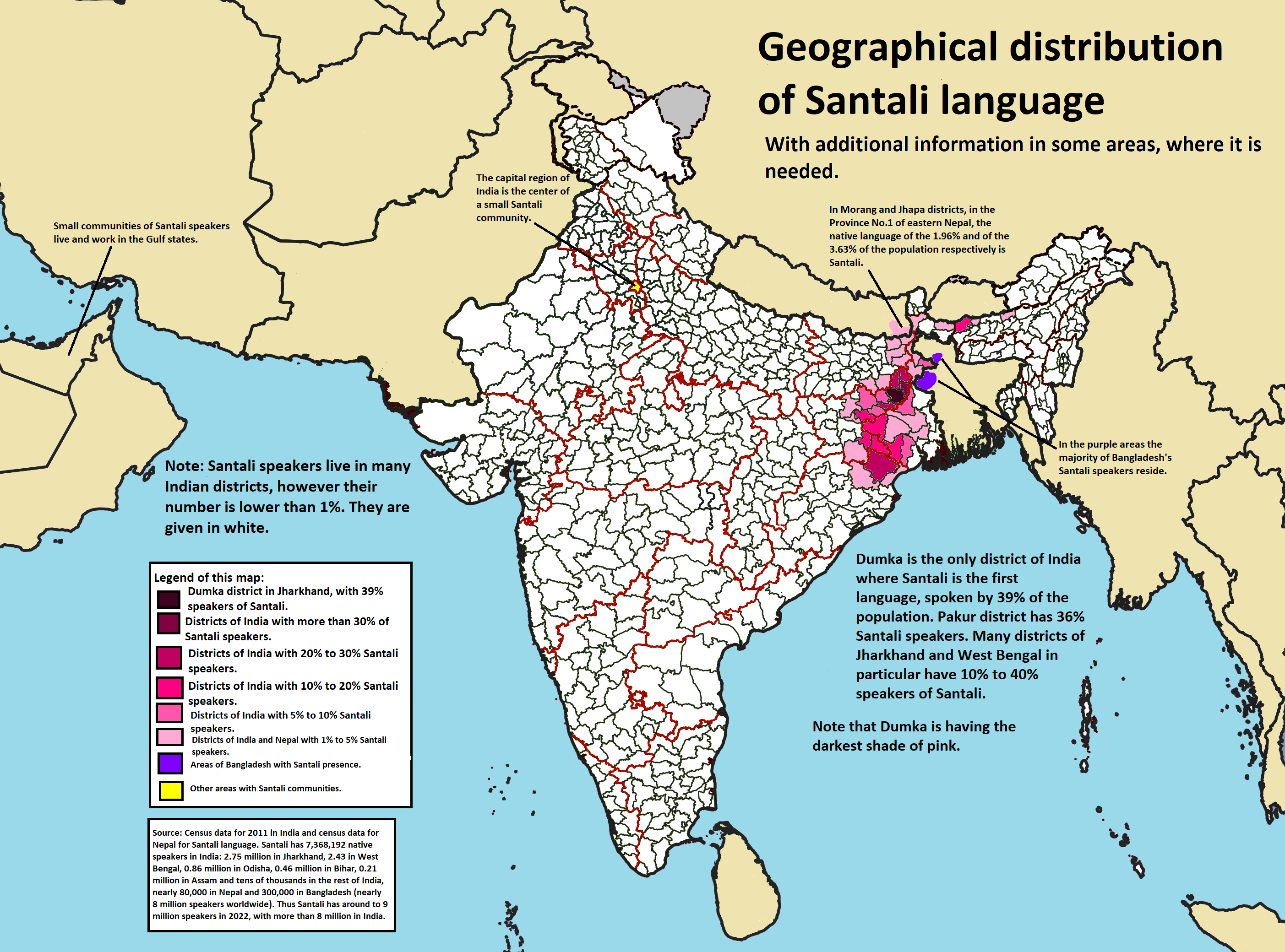 네팔은 산탈어가 사용되는 국가 중 하나이나, 해당 내용은 원본 소스에 존재하지 않으므로, 이 섹션에서는 인도 내 산탈어 사용 지역 분포에 대해서 다룬다.