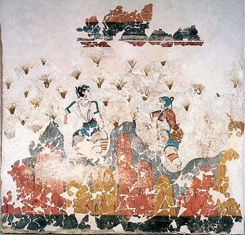 1967년 스피리돈 마리나토스의 지휘 아래 아크로티리 유적 발굴이 시작되면서, 테라 섬은 크레타 섬 밖에서 가장 유명한 미노아 문명 유적지가 되었다. 발굴 결과, 8미터 높이의 벽 잔해와 함께 여러 층 건물, 거리, 광장 등이 발견되었으며, 이 모든 것이 화산재에 묻혀 있었다. 이 유적은 크레타 섬에서 발견된 궁전 단지나 상인들의 창고 집합체가 아니라, 뛰어난 석조 기술과 훌륭한 벽화를 통해 복잡한 공동체였음을 보여준다. 직물 작업장은 수출을 위한 조직적인 직물 제직이 이루어졌음을 시사한다. 이 청동기 시대 문명은 기원전 3000년에서 2000년 사이에 번성했으며, 기원전 2000년에서 1630년 사이에 절정에 달했다.[8]