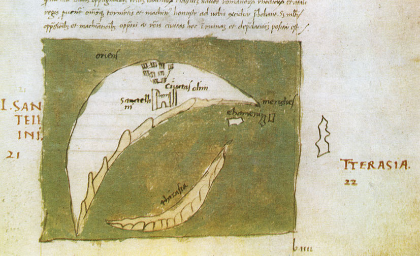 약 3600년 전 미노아 문명의 절정기에 미노스 화산 분화(혹은 테라 화산 분화)가 일어났다. 이는 지난 수천 년 동안 인류 역사상 가장 큰 화산 분화로 알려져 있다. 이 분출로 인해 거대한 칼데라가 생기고, 주변에는 수 미터 높이로 화산재가 쌓였다.