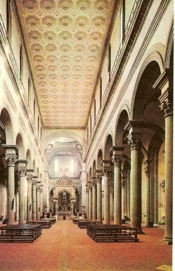 산 로렌초와는 달리, 이곳에서는 브루넬레스키의 구상이 적어도 평면도와 아케이드 수준까지는 어느 정도 충실하게 구현되었다. 라틴 십자형 평면은 격자 구조를 명확히 드러내도록 설계되었으며, 산 로렌초에서 문제가 되었던 본당과 익랑 간의 대비 문제도 피했다. 측면 예배당들은 모두 동일한 크기(총 40개)의 틈새 형태로 건물 전체를 따라 이어진다.