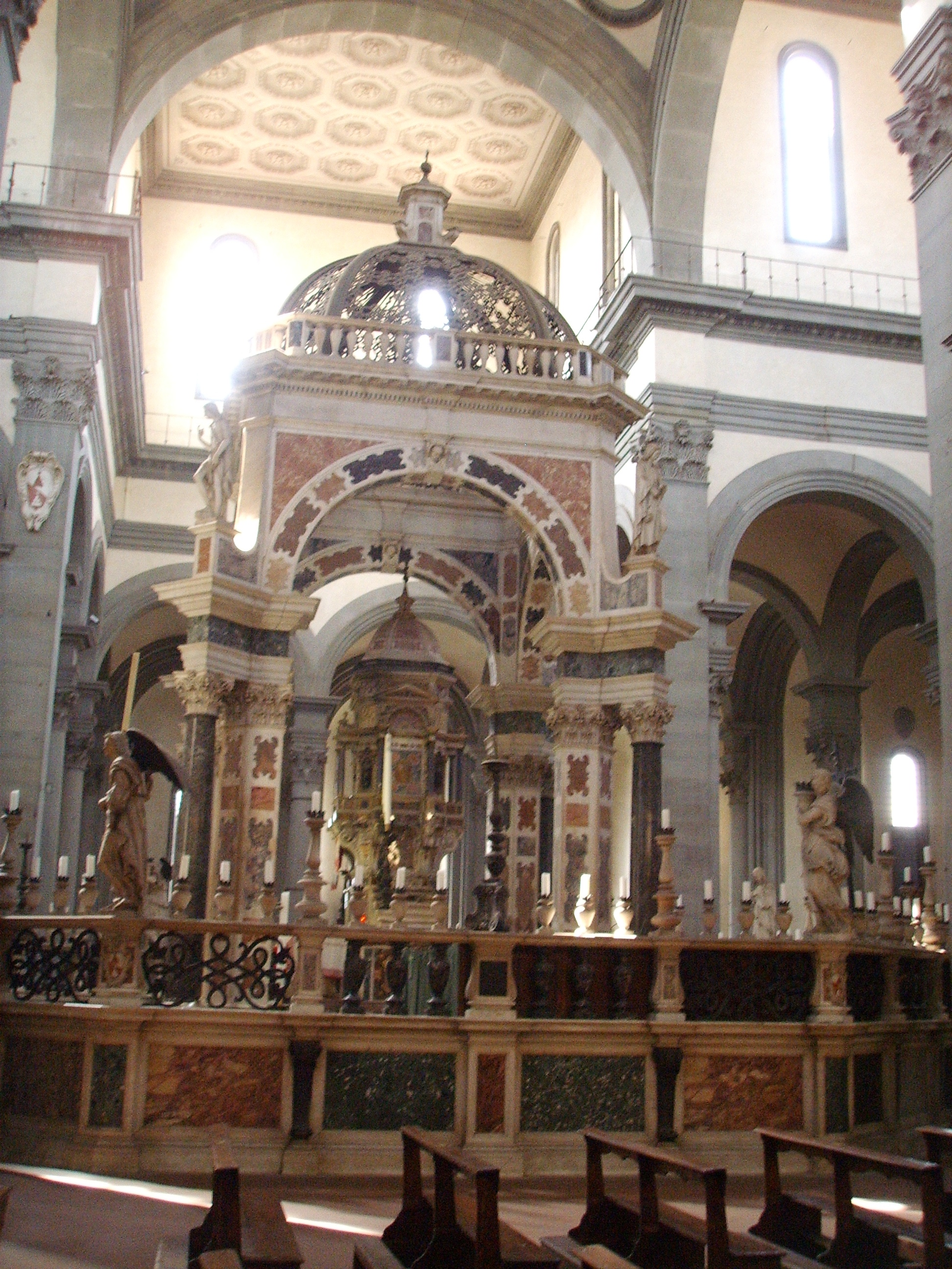 1489년에는 건물 왼편에 시모네 델 폴라이올로(일 크로나카)와 줄리아노 다 상갈로가 설계한 기둥이 있는 현관과 팔각형 성물실이 추가로 건설되었으며, 예배당에 문을 내어 본당과 연결했다.