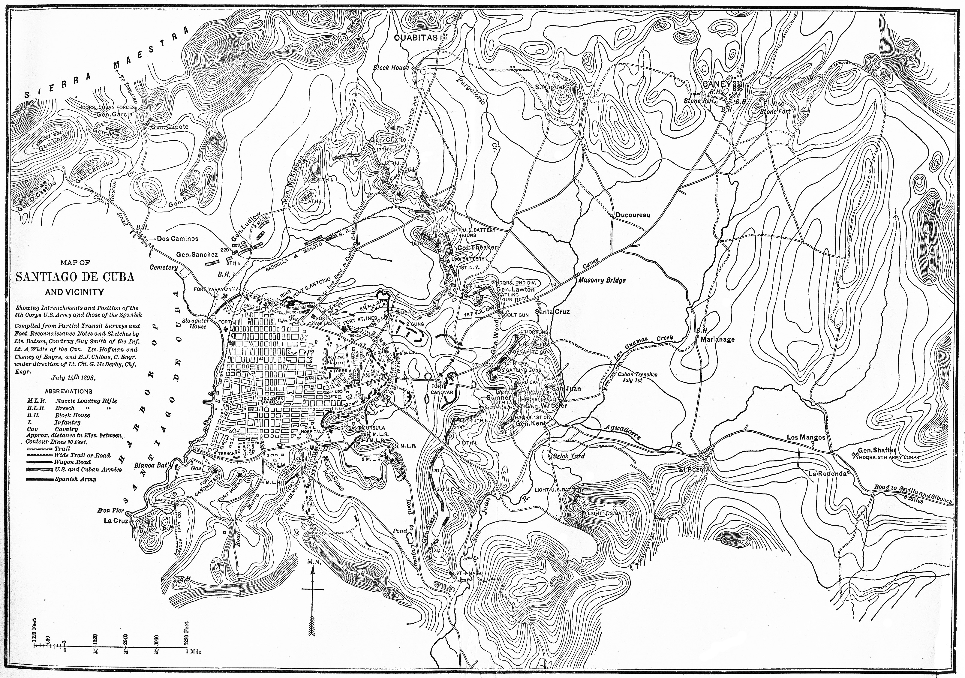 세기말 미국-스페인 전쟁 당시 산티아고는 1898년 7월 1일 산후안 언덕에서 스페인군이 패배한 주요 장소였다. 주변 언덕을 점령한 후, 미국의 윌리엄 러퍼스 섀프터 장군은 도시를 포위 공격했다.[8] 나중에 윌리엄 T. 샘프슨 제독이 1898년 7월 3일 산티아고 항구 바로 바깥에서 스페인 대서양 함대를 격파한 후 스페인은 미국에 항복했다.[8][9] 쿠바는 스페인으로부터 독립을 선언했지만 수년 동안 미군의 점령을 받았다.