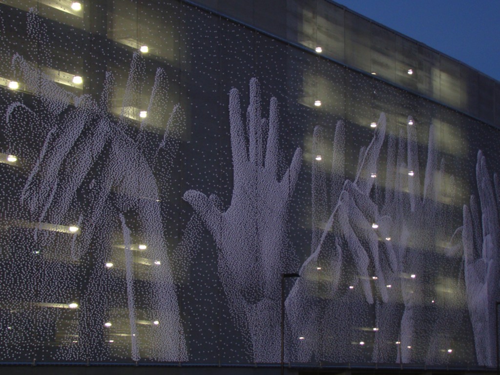 예술가 크리스티안 뫼러(Christian Moeller)의 작품인 ''Hands''가 차고 3의 정면을 덮고 있다.