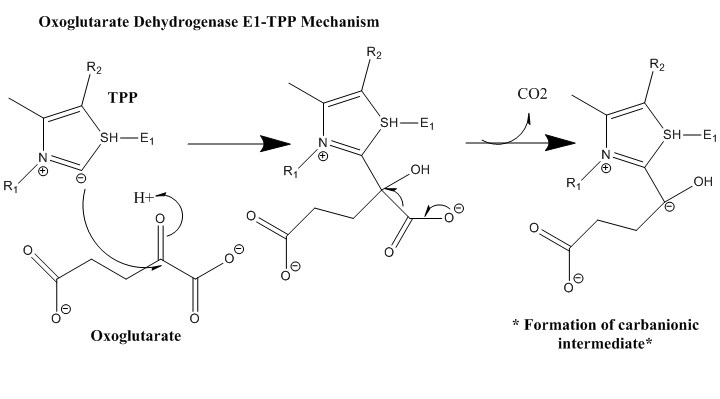 왼쪽부터 시작하여, 티아졸 고리의 비정상적으로 산성인 C2로부터 H+가 떨어져 나가면서 생성된 탄소 음이온인 TPP 보조 인자의 티아졸리움 형태는 피루브산의 카보닐 탄소를 공격하여 그림 상단에 표시된 화합물을 형성한다. 이 화합물은 쉽게 탈카복실화(카복실기가 떨어져 나감)를 겪을 수 있으며, 생성물인 하이드록시에틸 TPP는 공명에 의해 안정화된다. 다음 단계는 티아민 피로인산(TPP)의 하이드록시에틸 부분을 리포아마이드 보조 인자의 산화된 형태로 전달하는 것이다. 하이드록시에틸기는 전자가 풍부하여 리포아마이드와의 반응에서 카복실기 수준으로 산화되는 반면, 리포아마이드는 환원된다. 이 반응은 두 단계로 나눌 수 있다. 첫 번째 단계에서는 티아민 피로인산(TPP)에 부착된 하이드록시에틸기의 전자가 풍부한 탄소 원자가 강한 친핵체로서 산화된 리포아마이드의 분자 내 이황화물의 상대적으로 전자가 부족한 황 원자 중 하나를 공격한다. 그 결과 헤미 싸이오케탈 형태의 중간생성물이 생성된다. 다음 단계에서 티아민 피로인산(TPP)이 이탈기로 떨어져 나가면서 결합으로부터 하이드록시에틸기로 전자를 가져가고, 하이드록시에틸은 효소 유래 염기의 도움을 받아 O-H 결합으로부터 전자를 모집하여 생성된 수소 이온을 받아들인다. 이 두 단계의 결과는 싸이오에스터 아세틸 리포아마이드의 생성 및 보조 인자인 티아민 피로인산(TPP)의 재생이다. 이러한 모든 반응은 피루브산 탈수소효소(E1)에 의해 촉매된다.