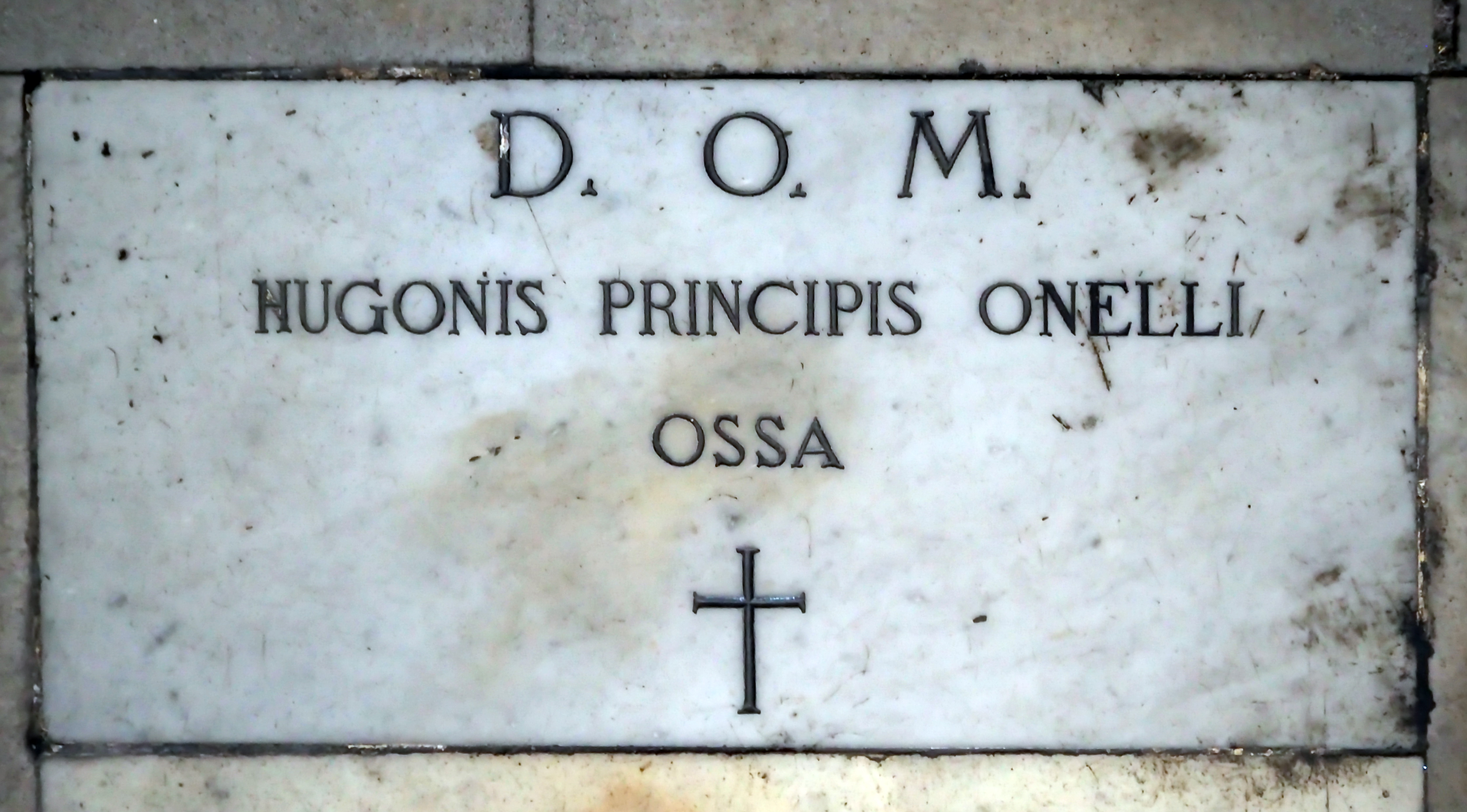 타이론은 1616년에 사망했고, 자금이 거의 남지 않아 교회에 덜 엄숙하게 묻혔다. 원래 묘비는 1849년경 유실되었지만, "D.O.M. Hugonis principis ONelli ossa" (가장 훌륭하고 위대한 신께 헌정. 휴 오닐 왕자의 유해)라는 비문 내용은 복사되었다. 1989년, 토마스 오피아치 추기경은 같은 비문이 새겨진 새로운 대리석 명판을 원래 위치에 놓았다.[7][4]