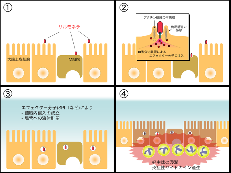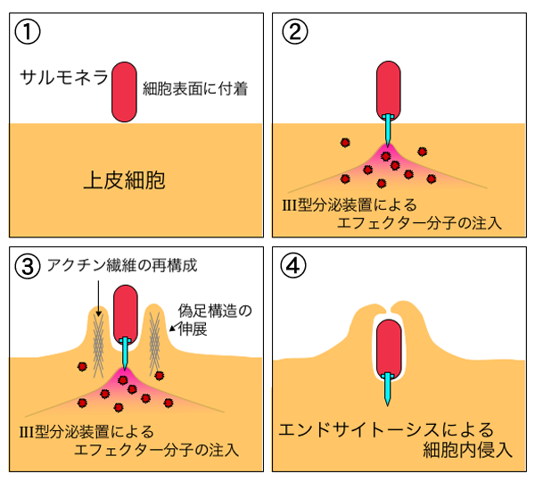 살모넬라의 상피세포 세포내 침입에는 III형 분비 장치가 관여한다.[107] III형 분비 장치는 세균의 세포질 단백질을 세포 외부로 분비하기 위한 기구로, 세균의 편모와 유사한 구조체이다. 편모의 섬모에 해당하는 단백질을 숙주 세포에 찔러 넣어 이펙터 분자라고 불리는 단백질을 세포 내부에 직접 보낸다.[108]