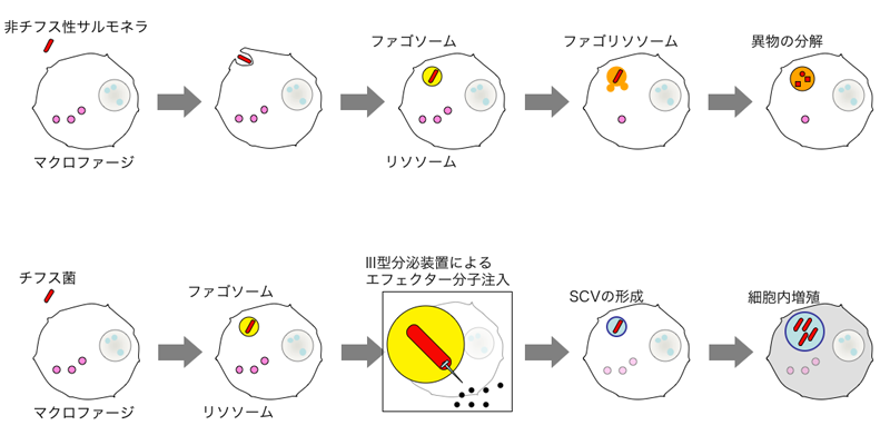 반면 티푸스균은 파고솜 내부에서 소포막을 매개로 III형 분비 장치를 세포질 쪽으로 찔러 넣고, SPI-2 유전자 영역에 코딩된 티푸스균 특이적 효과 분자군을 주입한다. 이 효과 분자군은 파고솜과 리소좀의 융합을 저해하여 파고리소좀 형성을 억제, 티푸스균은 식균을 회피한다. 리소좀과 융합이 저해된 파고솜은 SCV(salmonella-containing vacuole)라는 특수 소포가 되고, 티푸스균은 그 내부에서 증식한다.