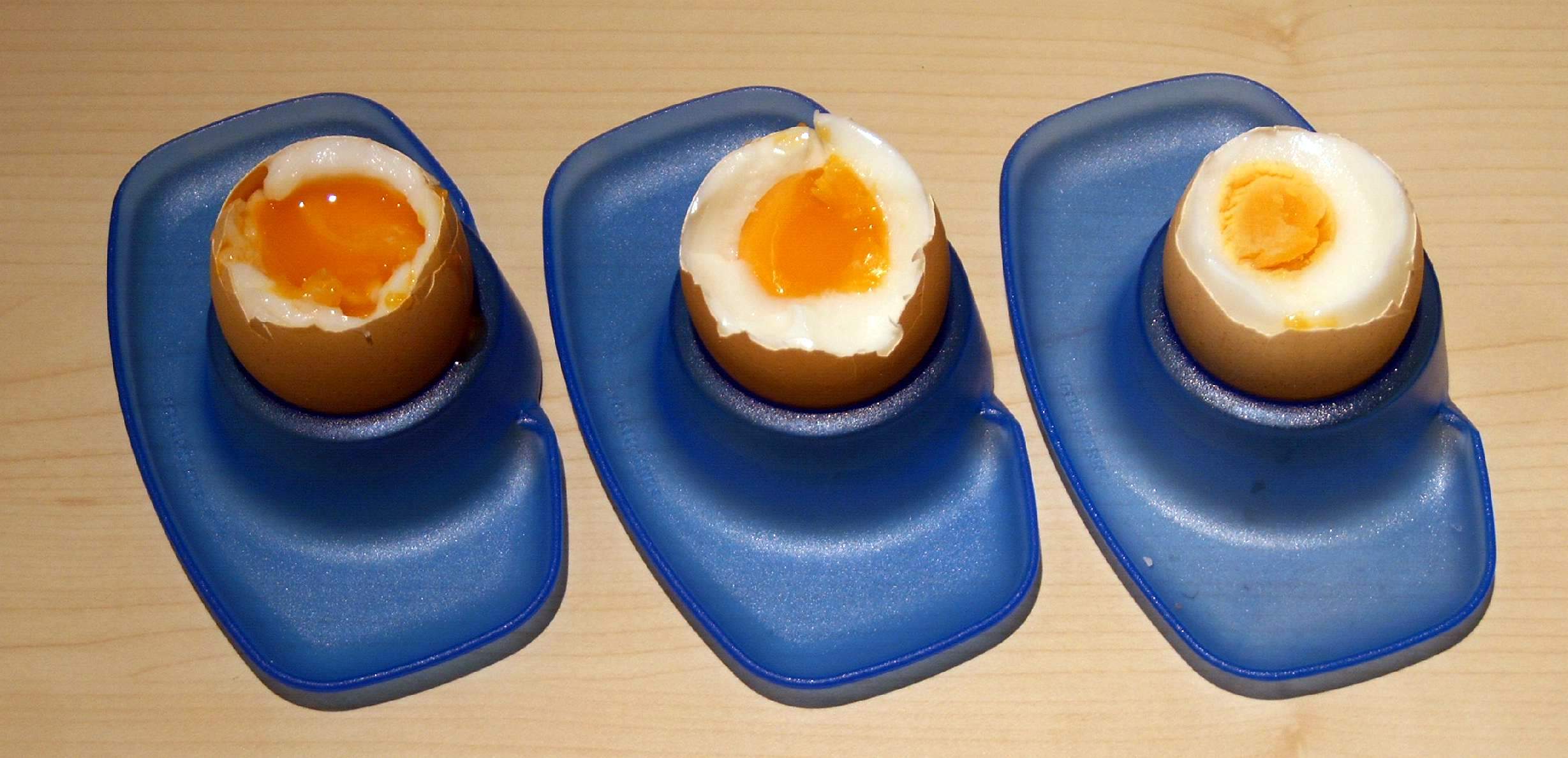 - 전통적인 계란 타이머는 반숙 계란을 익히는 데 3분을 측정하지만,[17] 일부 조리법 안내서는 5분[5]에서 6분[41]까지 더 긴 조리 시간을 권장한다. 셰프 헤스턴 블루멘탈은 차가운 물에 계란을 넣고 물이 끓기 시작하자마자 불에서 내려 6분간 익히는 레시피를 발표했다.[18]
