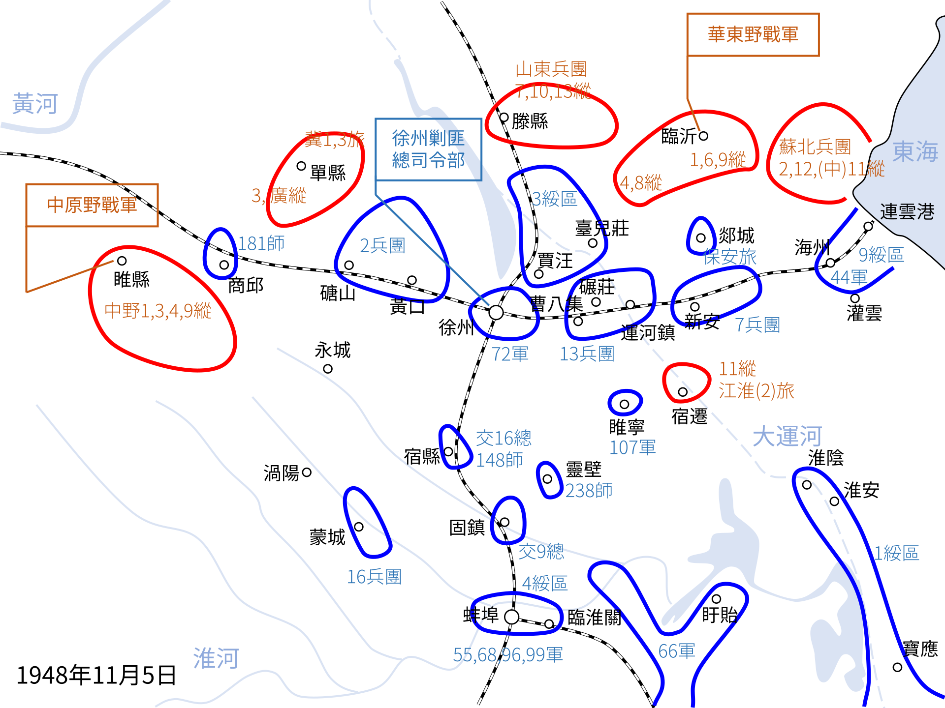 1948년 11월 5일 화이하이 전역 시작 시기 양 군의 배치도.