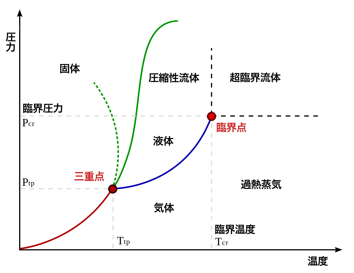 상평형 그림에서 세 상전이 곡선(융해 곡선, 증기 압력 곡선, 승화 곡선)이 만나는 점이 삼중점이다. 삼중점에서는 고체, 액체, 기체가 공존한다.