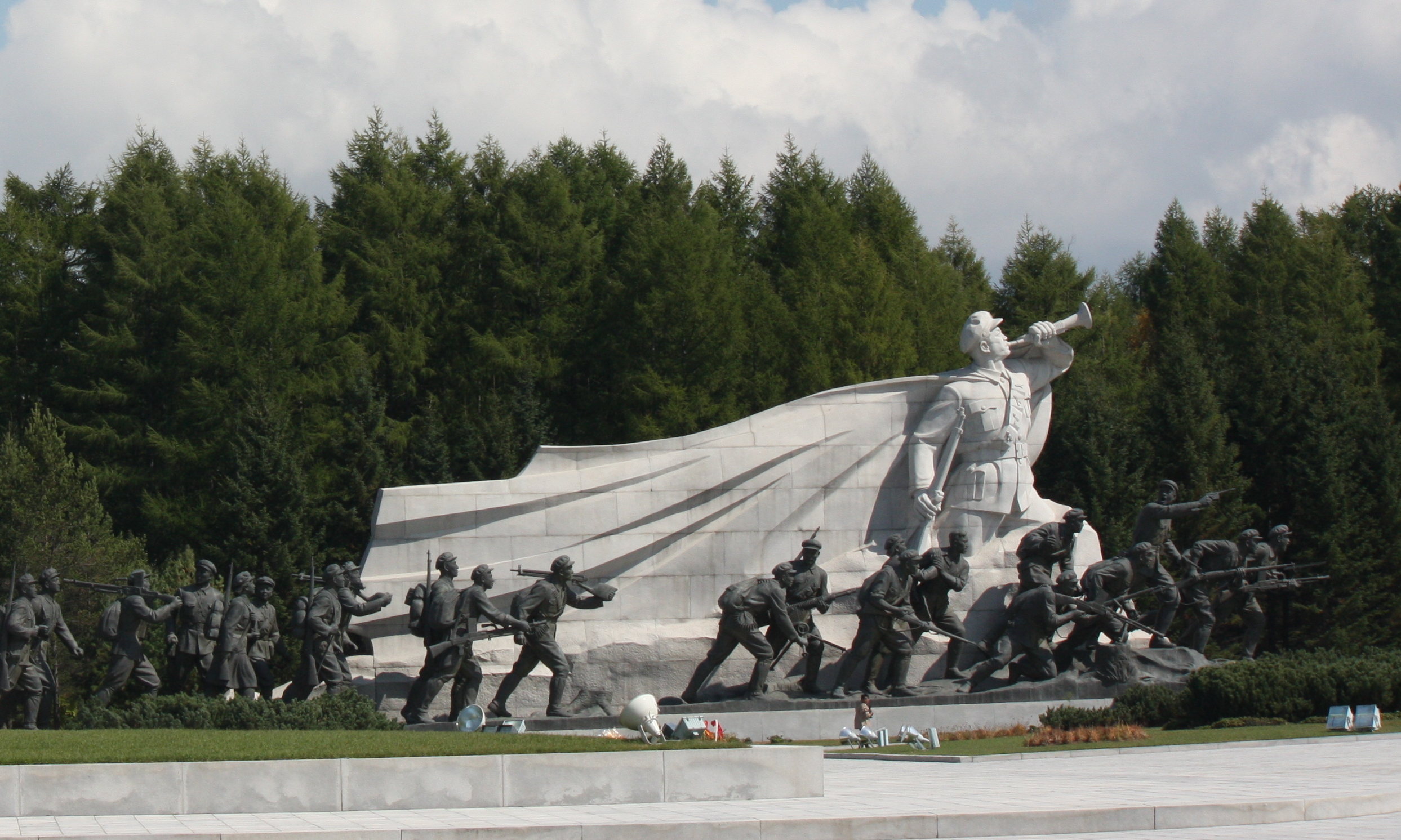 - '''삼지연 대기념비''': 조선인민혁명군의 조국 진군을 기념하여 건립된 기념비이다. 김일성 동상을 중심으로 폭 250m로 축조되었다. 한쪽에는 봉화탑(50m)과 혁명사적비, 다른 한쪽에는 "진격의 나팔수"(12m), 정면에 "조국편", "흠모편", "진군편", "숙영편", "조국의 물" 등 80여 개의 조각상으로 이루어진 군상이 늘어서 있다. '전투의 길에서', '조국', '그리움', '앞으로'라는 4개의 조각상 그룹으로 구성되어 있다.[8]