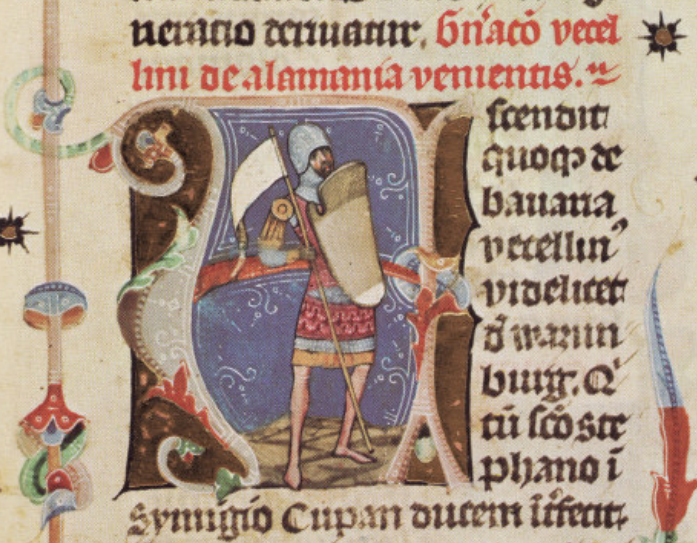헝가리 대공 알모스가 칼과 투룰 방패를 들고 있는 모습.[13]