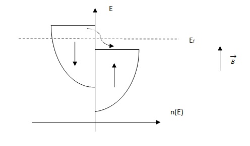 전기 전도체 물질에서는 전자가 비국재화되어 자유전자와 유사하게 물질 내를 운동한다. 전도성은 밴드 구조 그림에서 에너지 밴드의 빈 공간을 채우듯 전자가 올라오는 것으로 이해된다. 일반적인 비자성 전도체는 스핀이 위쪽인 전자와 아래쪽인 전자가 하나의 궤도에 함께 들어 있다. 그러나 자기장이 가해지면 전도띠는 스핀 방향에너지 차이로 스핀 업과 스핀 다운으로 분리된다.[9]