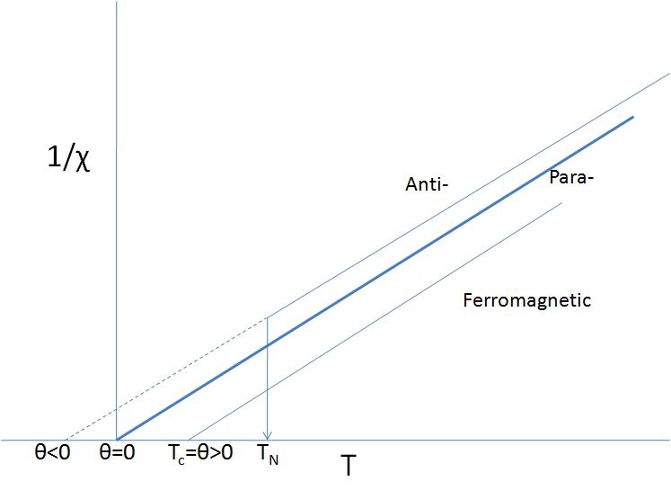 이 수정된 법칙에는 열 운동에 의해 극복되지만 존재하는 교환 상호 작용을 설명하는 θ 항이 포함되어 있다. θ의 부호는 강자성 또는 반강자성 상호 작용이 지배적인지에 따라 달라지며, 위에서 언급한 희석된, 고립된 경우를 제외하고는 거의 0이 아니다.