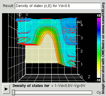 LDOS는 고체 소자에서 이익을 얻는 데 사용될 수 있다. 예를 들어, 오른쪽 그림은 탄도적 시뮬레이션에서 트랜지스터가 켜지고 꺼질 때의 LDOS를 보여준다. LDOS는 소스와 드레인에 명확한 경계를 가지고 있으며, 이는 띠 가장자리의 위치에 해당한다. 채널에서 DOS는 게이트 전압이 증가하고 포텐셜 장벽이 감소함에 따라 증가한다.