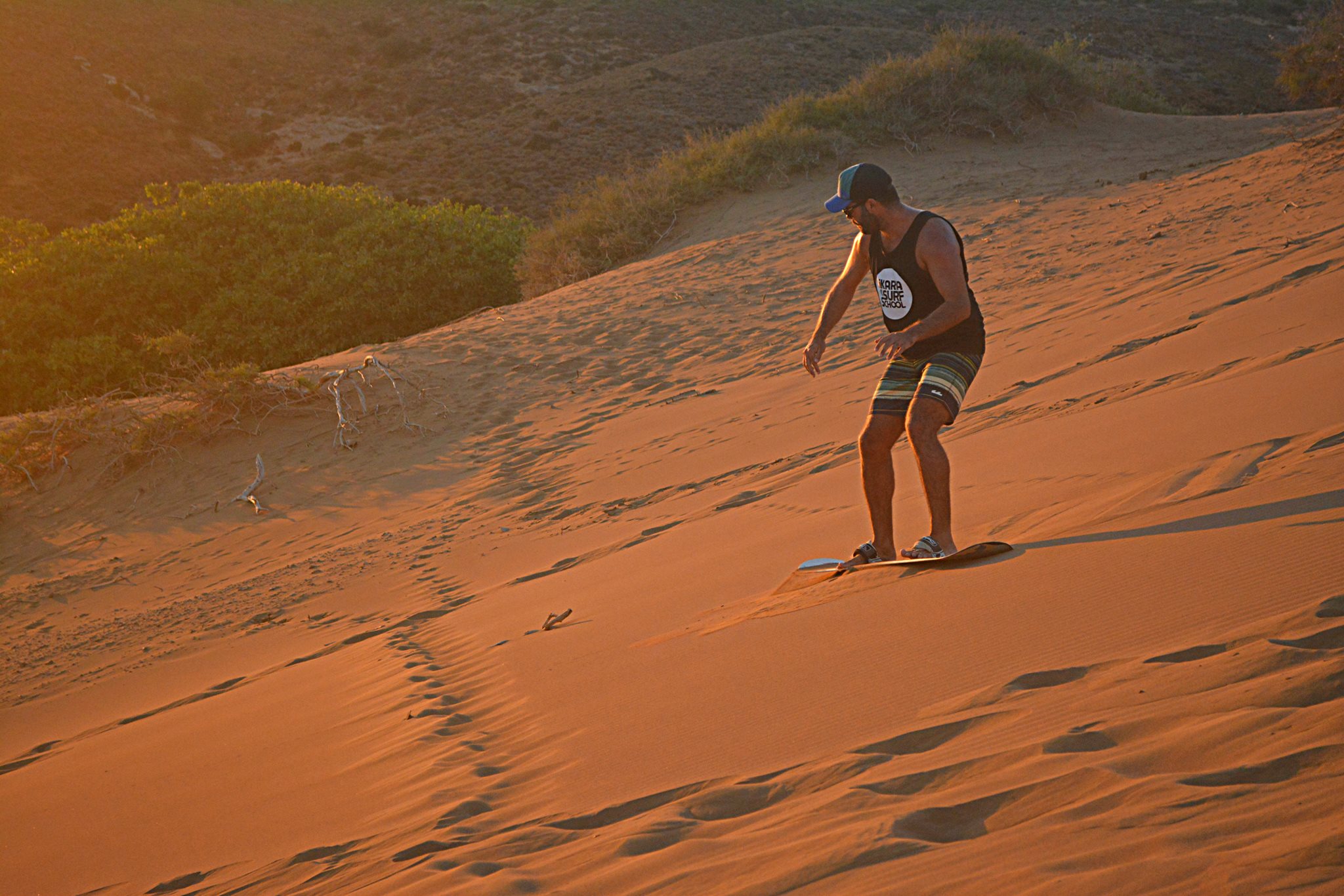 설명 | 샌드보딩은 모래 언덕 위에서 보드를 타고 내려오는 스포츠이다. 스노보드나 서핑과 유사한 기술을 사용한다. |