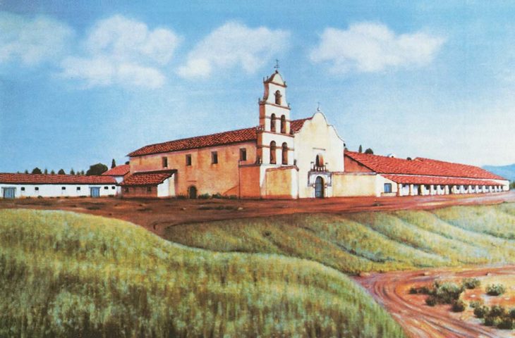 유럽 식민화는 1769년 신에스파냐와 바하 캘리포니아 반도에서 온 네 부대의 에스파냐인들이 도착하면서 시작되었다. 두 척의 선박이 산디에고 만에 도착했는데, 비센테 빌라가 지휘하고 엔지니어이자 지도 제작자인 미구엘 코스탄소와 군인이자 미래의 주지사인 페드로 파헤스를 포함한 ''산 카를로스''호와 후안 페레스가 지휘한 ''산 안토니오''호였다. 남쪽에서 산디에고로 향한 최초의 육로 원정대는 군인 페르난도 리베라가 이끌었고, 프란치스코회 선교사이자 탐험가이자 기록자인 후안 크레스피를 포함했으며, 그 뒤를 지정된 주지사 가스파르 데 포르톨라가 이끄는 두 번째 부대가 뒤따랐는데, 여기에는 선교 대표이자 성인인 후니페로 세라가 포함되어 있었다.[29]