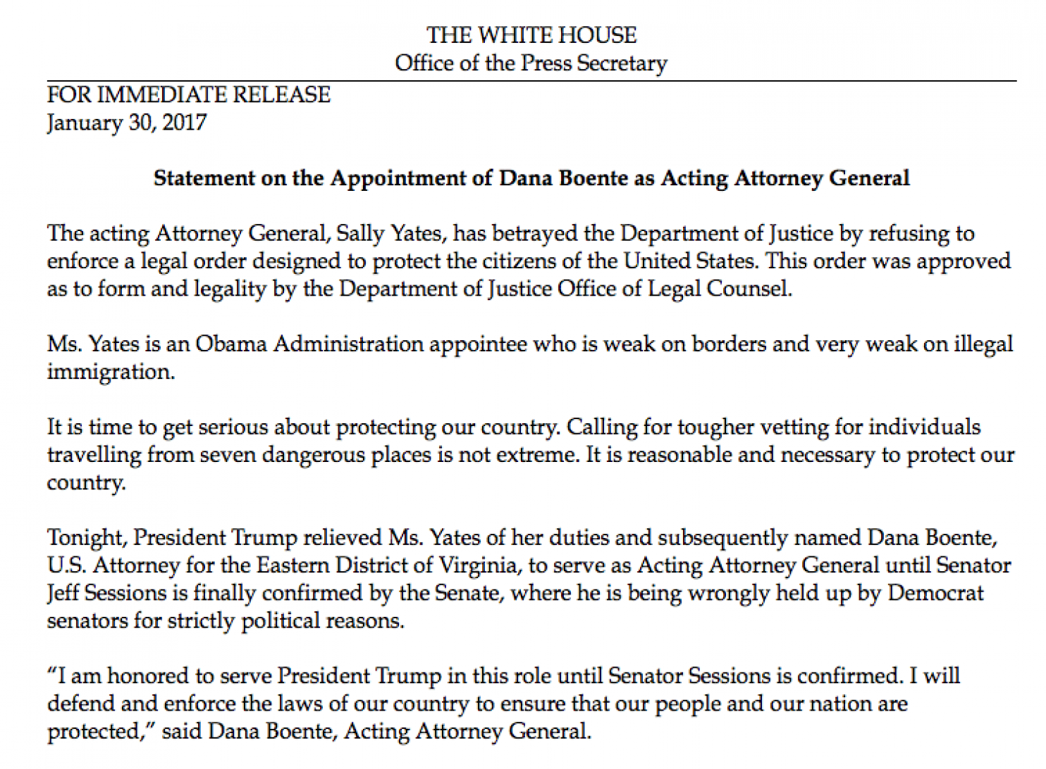 예이츠는 서한에서 "현재 저는 (무슬림 7개국 국민의 미국 입국을 한시적으로 금지한) 행정명령의 변호가 법무부 책임의 도리에 맞는지 확신할 수가 없으며, 적법한지도 확신할 수가 없습니다. 저는 법원에서의 우리 직책이 언제나 정의를 추구하고 옳은 것을 지지한다는 엄숙한 의무를 유지할 책임이 있습니다. 제가 법무장관 대행으로 있는 한, 법무부는 이 행정명령이 그렇게 시행하는 것이 적절하다고 확신할 때까지 행정명령을 변호하기 위한 논쟁을 하지 않을 것입니다."라고 밝혔다.[114][115][116]