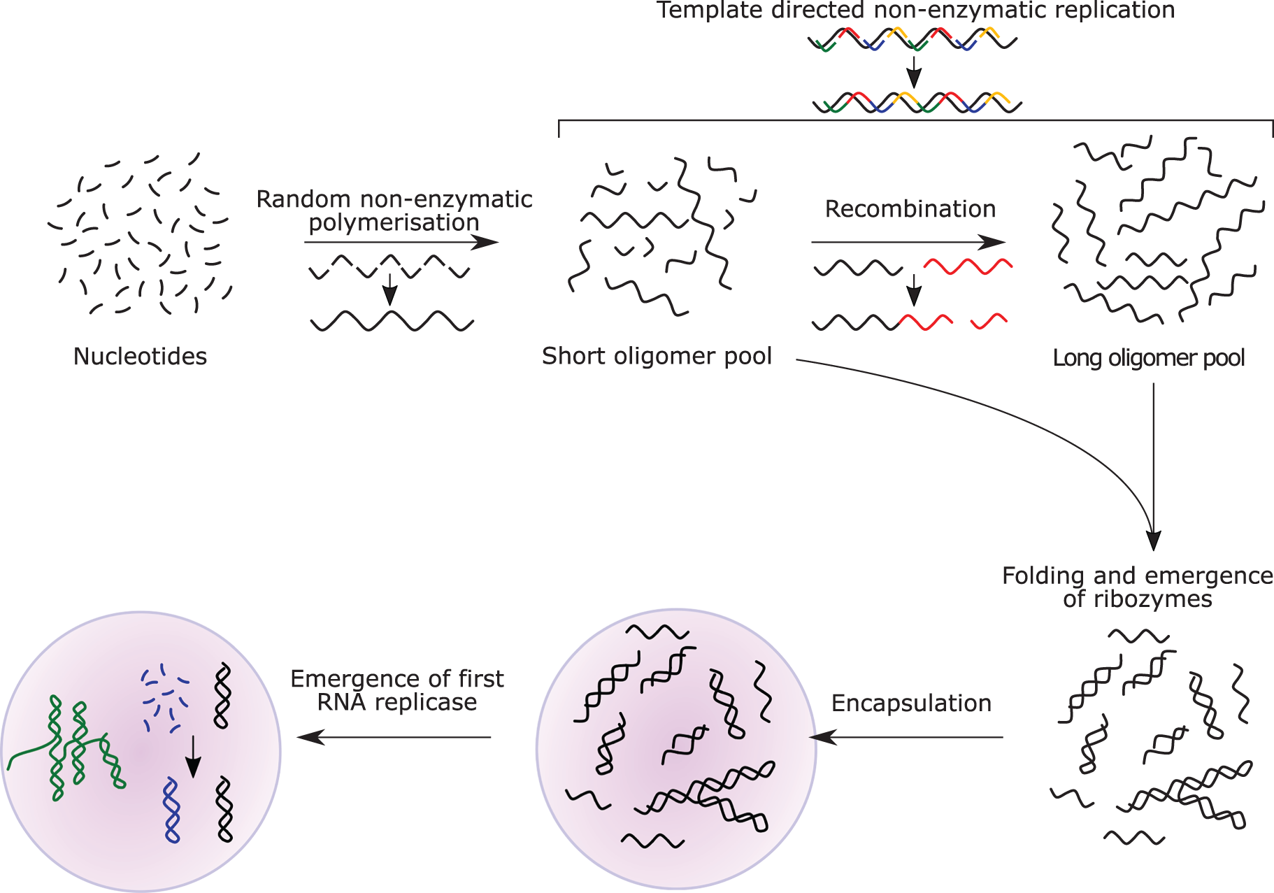 생명은 (유전적인) 변이를 동반한 복제로 구성된다.[1] NASA는 생명을 "다윈적(즉, 생물학적) 진화가 가능한 자기 지속적인 화학 시스템"으로 정의한다.[2] 이러한 시스템은 복잡하다. 약 40억 년 전에 살았던 단세포 유기체였을 것으로 추정되는 마지막 만능 공통 조상(LUCA)은 이미 오늘날 보편적인 DNA 유전 암호에 수백 개의 유전자를 암호화하고 있었다. 이는 전령 RNA, 운반 RNA, 그리고 리보솜을 포함한 세포 기계의 집합체가 암호를 단백질로 번역하는 것을 의미한다. 이러한 단백질에는 우드-융달 대사 경로를 통해 혐기성 호흡을 수행하는 효소와 유전 물질을 복제하는 DNA 중합효소가 포함되어 있었다.[5][6]
