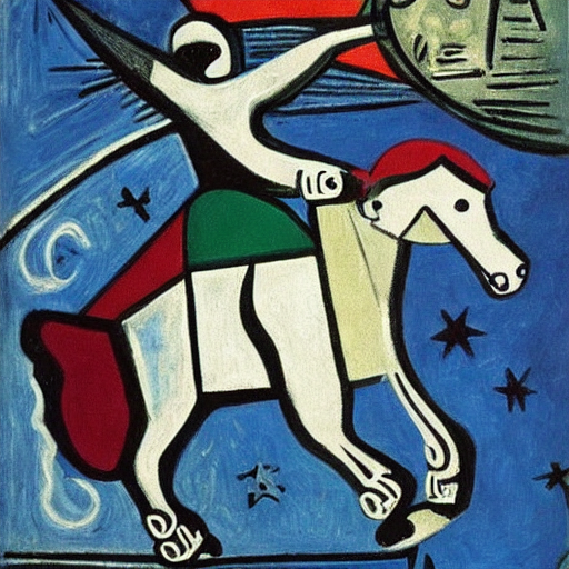"피카소 스타일의 우주 비행사가 말을 타는 모습"이라는 프롬프트를 사용하여 Stable Diffusion이 생성한 이미지.