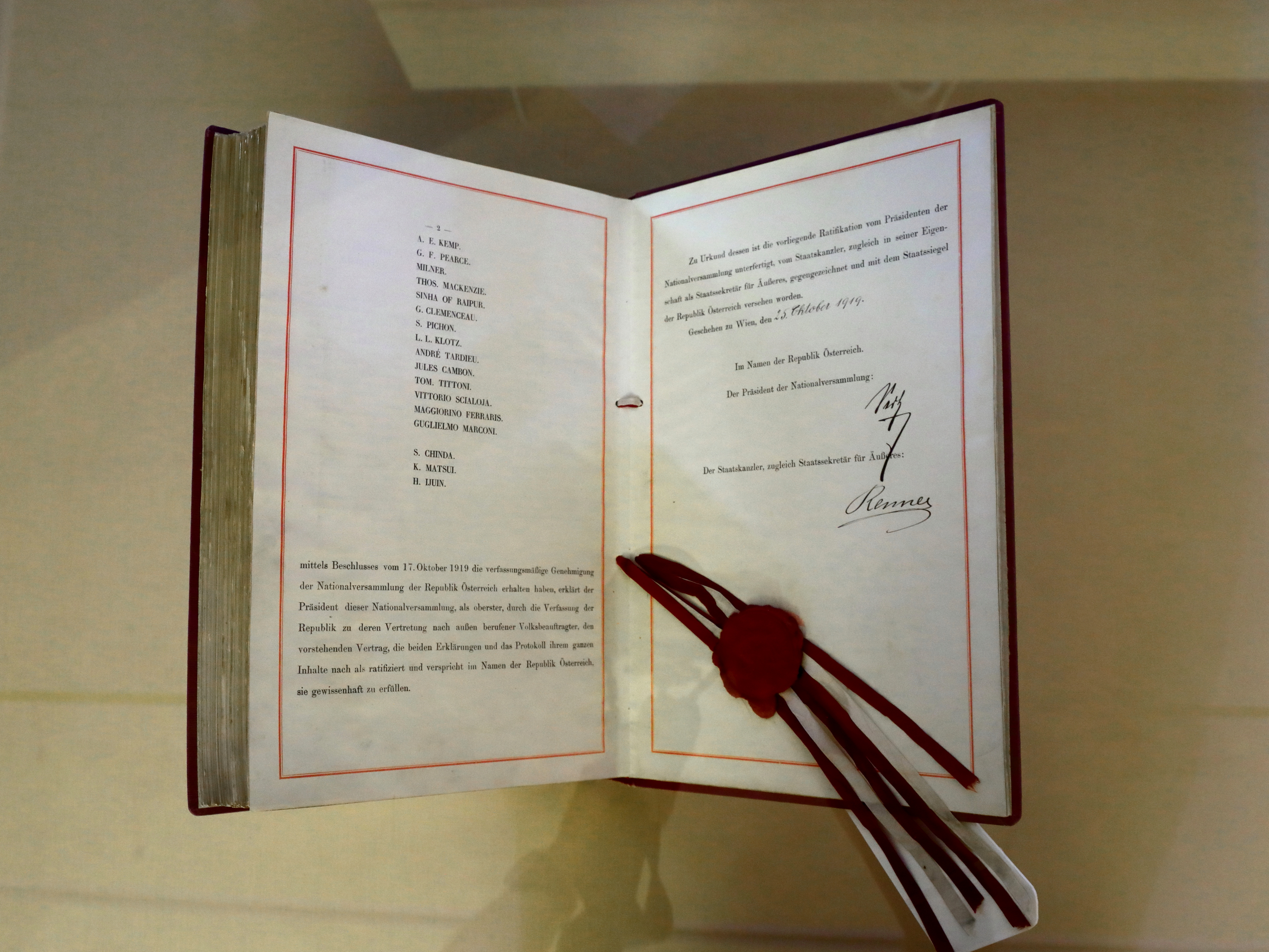 오스트리아-헝가리 제국은 제1차 세계 대전 말 이탈리아 왕국의 공세와 여러 민족의 반란으로 내전 상태에 빠졌고, 1918년 11월 3일 이탈리아 왕국과 빌라 지우스티 휴전 협정을 맺고 패배했다. 제국은 해체되었고, 새로 성립된 독일-오스트리아 공화국은 "오스트리아 공화국"으로 국호를 변경하고 조약에 서명했다. 조약에는 국제 연맹 이사회의 승인 없이는 오스트리아의 독립을 변경할 수 없다는 내용이 명시되어, 사실상 독일과의 합병(앙슐루스)이 금지되었다.