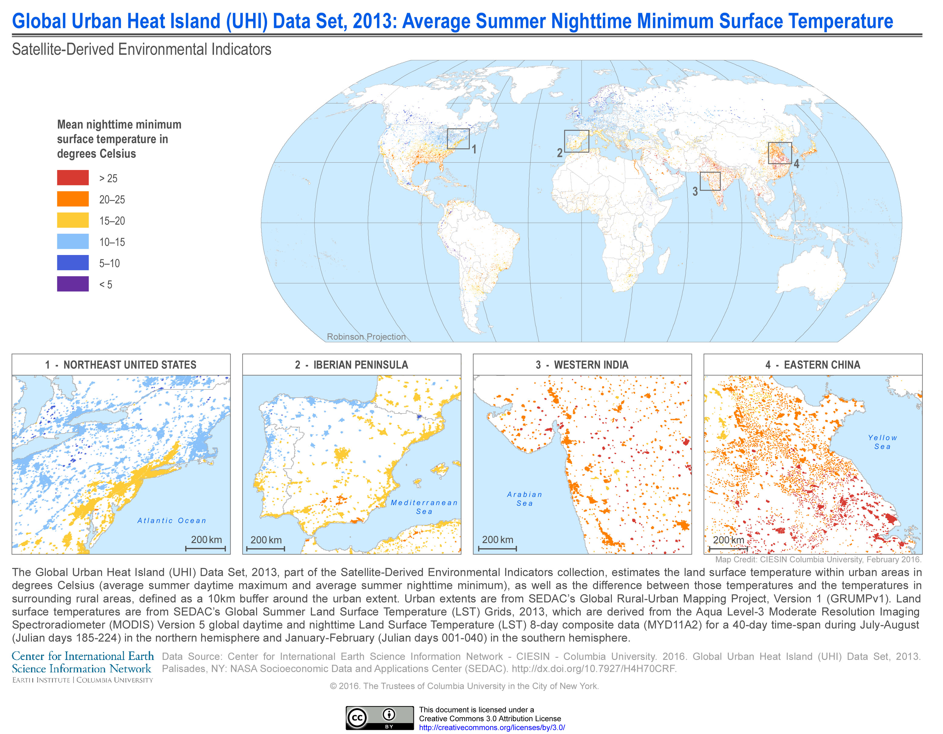 도시 지역은 열을 잘 흡수하는 불투수성 표면이 집중되어 있어 "열섬" 효과를 일으키고, 덜 개발된 지역보다 온도가 높다.[65] 열섬 효과로 인한 건강 문제는 기후 위기로 인한 폭염의 빈도 증가로 더욱 악화될 것이다.[66] 에어컨이나 나무 그늘에 접근하기 어려운 유아 및 노인은 이러한 위협에 특히 취약하다. 이러한 적응 능력 부족은 저소득층(LMI) 및 역사적으로 분리된 지역에 집중되어 있다.[66]