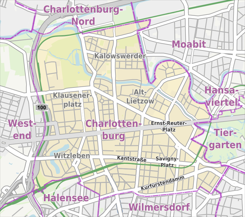 북쪽과 서쪽으로는 베를린 링반과 연방 고속도로 100번(Stadtring)이 샤를로텐부르크-노르트와 베스트엔트 교외 지역과의 경계를 이룬다. 남쪽에는 빌머스도르프 지역이 인접해 있다. 샤를로텐부르크는 또한 서남쪽으로는 할렌제 구역, 동쪽으로는 모아비트, 한자피르텔, 티어가르텐(모두 미테 구역에 속함)과 경계를 이루며, 동남쪽으로는 쇤베르크와 경계를 이룬다.