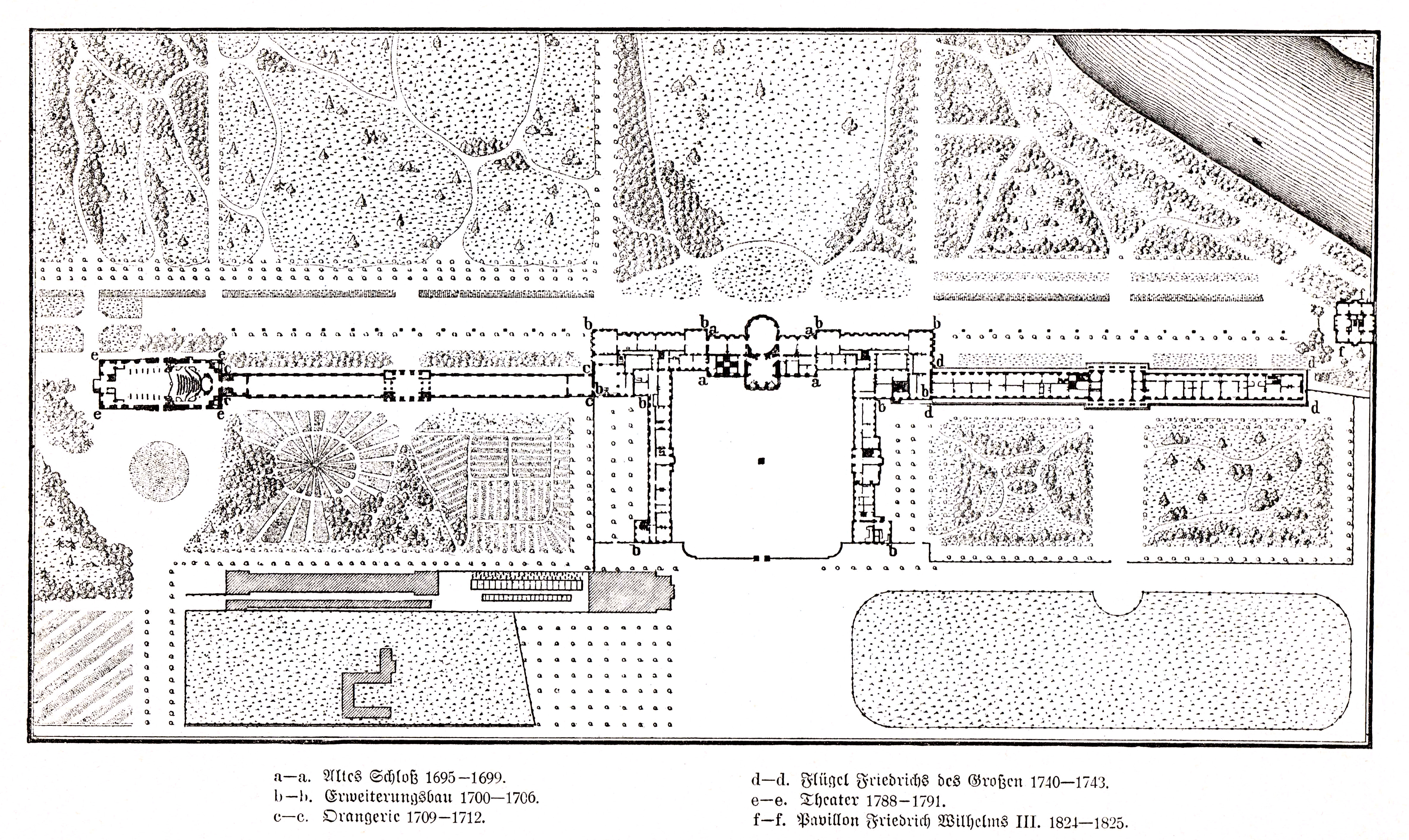 정원은 1697년 베르사유 정원 설계자인 앙드레 르 노트르의 영향을 받은 시메온 고도에 의해 바로크 정원 양식으로 설계되었다.[11] 고도에의 설계는 기하학적 패턴으로 구성되었으며, 가로수길과 해자를 갖추어 정원을 자연 환경과 분리했다. 정형 정원 너머에는 잉어 연못이 있었다. 18세기 말에 덜 형식적이고 더 자연스러운 정원 디자인이 유행했다. 1787년, 왕립 정원사 게오르크 슈타이너는 프리드리히 빌헬름 2세를 위해 영국식 정원 양식으로 정원을 재설계했으며, 이 작업은 페터 요제프 렌네가 감독했다.[11] 제2차 세계 대전 이후 정원 중앙은 이전의 바로크 양식으로 복원되었다.[11]1788년, 프리드리히 빌헬름 2세는 잉어 연못 너머 부지에 벨베데레를 건설하도록 했으며, 이는 카를 고트하르트 랑한스가 설계했다.[12] 이 건물은 찻집과 전망대로 사용되었다. 랑한스는 또한 오랑제리 날개의 서쪽에 1788년에서 1791년 사이에 건설된 궁전 극장도 설계했다.[12]