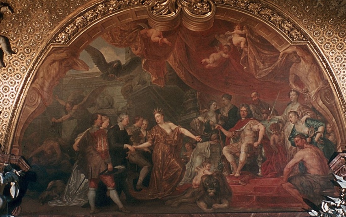다양한 예술가들이 궁전 내부를 장식하기 위해 초청되었다. 프리드리히 1세의 궁정 화가인 플랑드르 예술가 얀 안토니 코크시는 궁전의 다양한 방의 벽과 천장을 그리는 일을 의뢰받았다. 코크시는 1701년부터 1713년까지 궁전 예배당에 프레스코와 제단화를, 고블랭 갤러리와 도자기 방에 프레스코를 그렸다.[3] 도자기 방의 프레스코는 프리드리히 1세의 통치를 위한 노골적인 선전이었다. 그것들은 일곱 마리 말이 끄는 전차를 탄 새벽의 여신 아우로라가 밤을 쫓아내고 빛의 섬광 속에서 전차를 타고 다가오는 태양신 아폴로에게 길을 열어주는 모습을 표현한다. 머리 위로 맴도는 머큐리는 생명을 주는 신의 도착을 알리고, 사투르누스는 낫으로 황금 시대를 열어준다. 코크시는 또한 정치적 권력에 대한 익숙한 암시인 사계절과 사대륙의 이미지를 포함하여 프리드리히 1세의 위대함을 확언했다.[4]