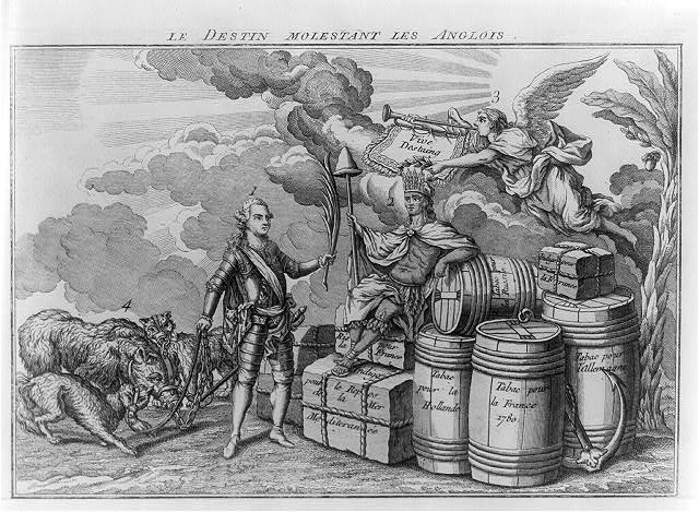 ''운명이 영국을 괴롭히다'', 데스탱이 미국에 종려 잎을 바치는 모습을 그린 당시의 풍자화