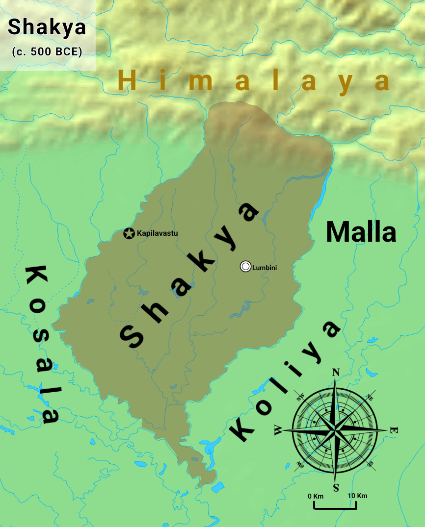 기원전 6세기 경, 샤카족은 서쪽의 코살라 왕국, 동쪽의 리차비족과 비데하 사이에 거주하며 밧지 연맹과 코살라 왕국을 분리했다. 샤카 공화국은 코살라 왕국의 봉신국이었다.[32]
