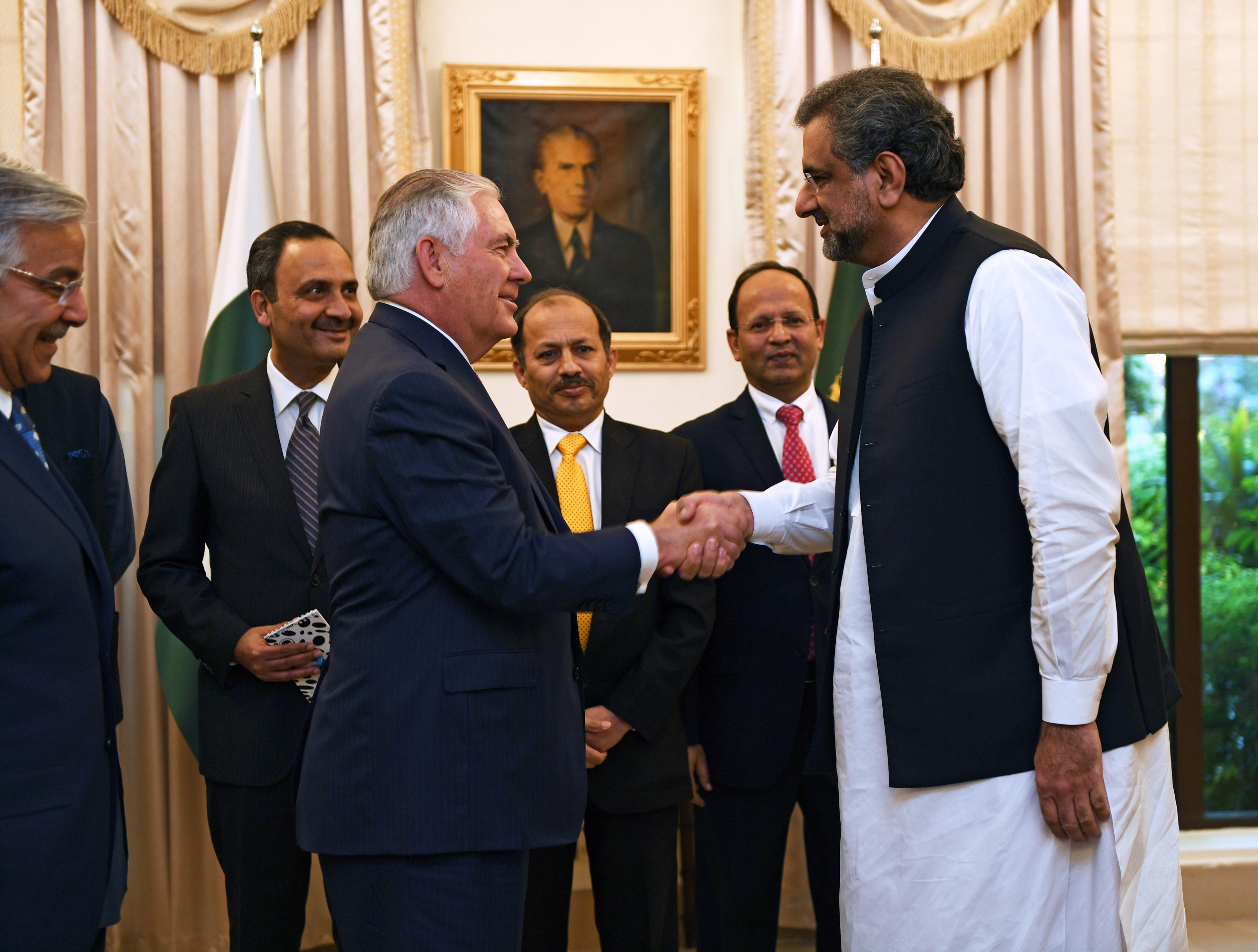 2017년 9월, 아바시는 제72차 유엔 총회에 참석하기 위해 미국을 방문했다. 방문 기간 동안 그는 미국 부통령 마이크 펜스를 만났고,[195] 트럼프와도 짧은 회담을 가졌다.[196] 2017년 10월 24일, 미국 국무장관 렉스 틸러슨은 8월 트럼프의 발언으로 긴장된 양자 관계를 정상화하기 위해 파키스탄을 처음 방문했다.[201]