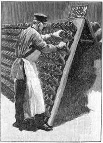 동 페리뇽은 원래 오빌레 수도원의 상관으로부터 기포를 없애라는 명령을 받았는데, 그 이유는 병 안의 압력으로 인해 지하 저장고에서 많은 병이 터졌기 때문이었다.[102] 18세기 초에 스파클링 와인 생산이 증가하면서, 지하 저장고 근로자들은 병이 저절로 터져 부상을 입지 않도록 무거운 철제 마스크를 착용해야 했다. 한 병이 폭발하여 발생한 혼란은 연쇄 반응을 일으킬 수 있었고, 지하 저장고에서 이런 식으로 병의 20~90%를 잃는 것은 흔한 일이었다. 당시 알려지지 않았던 발효 및 탄산 가스 과정을 둘러싼 신비한 상황 때문에 일부 비평가들은 스파클링 와인을 "악마의 와인"이라고 불렀다.[103]