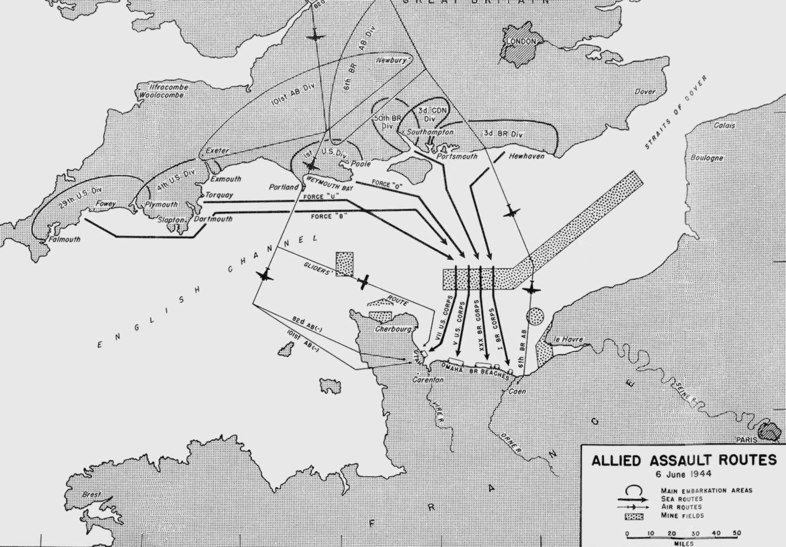 포티튜드 작전과 보디가드 작전등의 기만 작전으로 독일군이 침공이 파드칼레에서 일어날 것이라고 확신하게 만들었지만, 실제 목표는 노르망디였다.[36] 연합군은 상륙 지점 중 하나인 오마하 해안에서의 고전 등도 있었지만, 새벽부터 2개의 공수 사단이 교두보를 확보하고 15만 이상의 상륙 병력이 노르망디에 상륙하면서 교두보 확보에 성공했다.