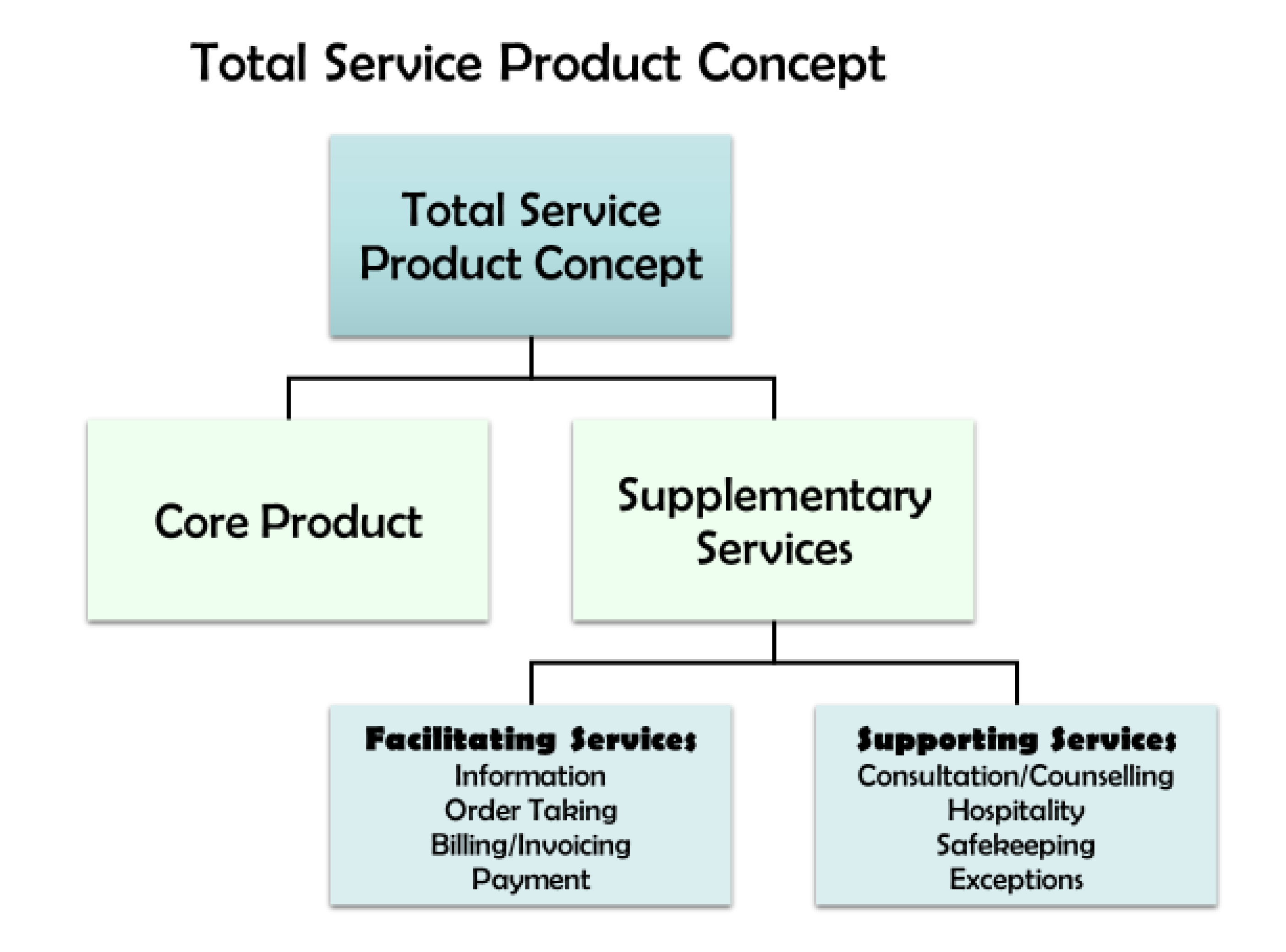 서비스를 위한 확장된 마케팅 믹스는 단순히 세 개의 P를 추가하는 것 이상이다. 오히려 서비스에 더 효과적으로 적용하기 위해 제품, 가격, 유통, 프로모션이라는 전통적인 믹스를 수정하는 것도 포함한다. 현대 서비스 마케팅 텍스트는 '7P' 또는 '8P' 프레임워크를 중심으로 구성되는 경향이 있다. 7P는 기존의 4P에 '프로세스', '사람', '물리적 환경'을 더한 것이다.[55] '8P' 프레임워크는 7P에 서비스 [수행] 또는 서비스 [품질]의 기준을 의미하는 '성과'를 더한 것이다.[56] 제품 (Product)서비스 제품은 유형 및 무형 요소의 묶음으로 구성되는 것으로 개념화된다.[46]