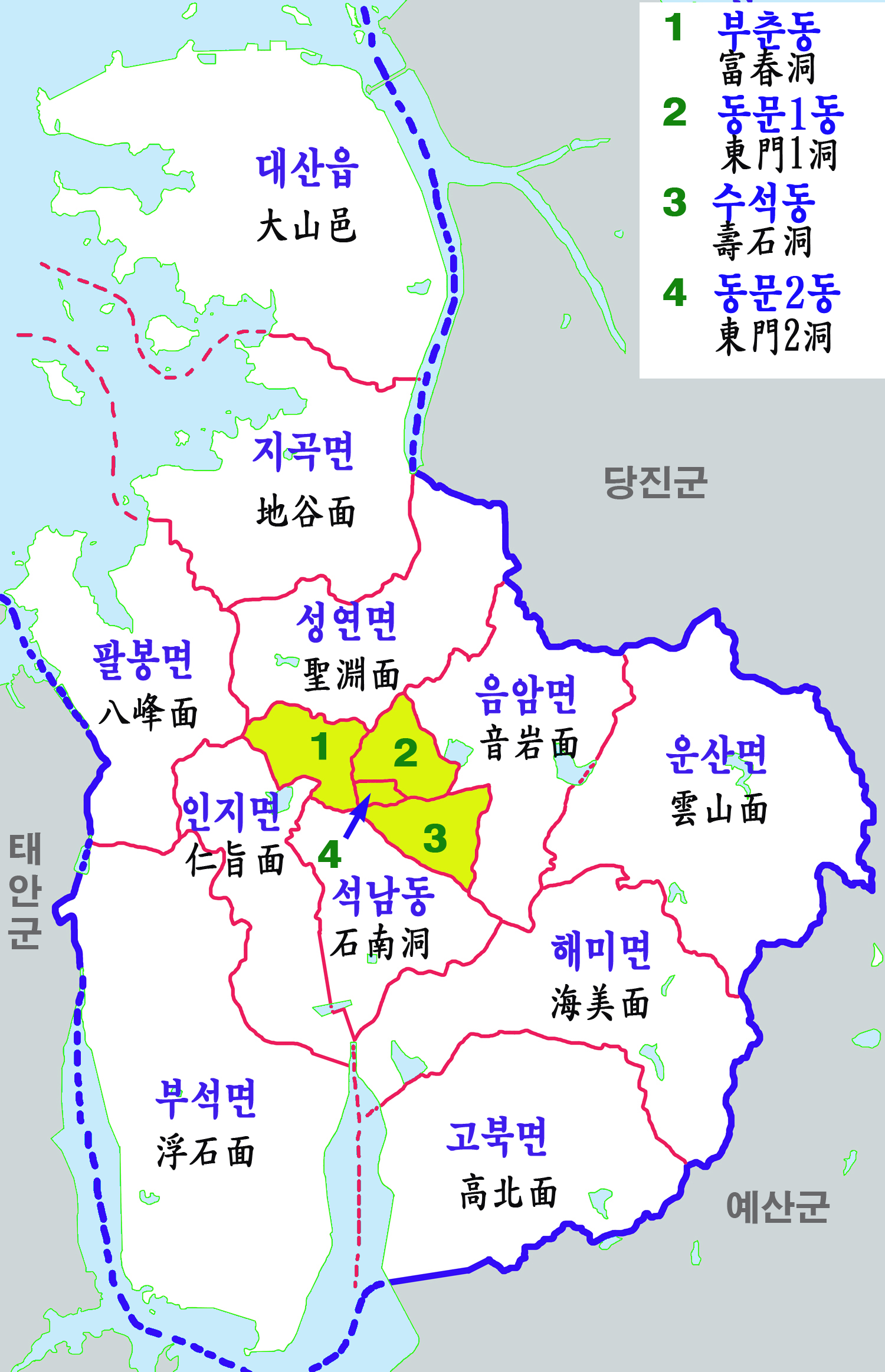 해미군 동면, 남면 | 지성면 |