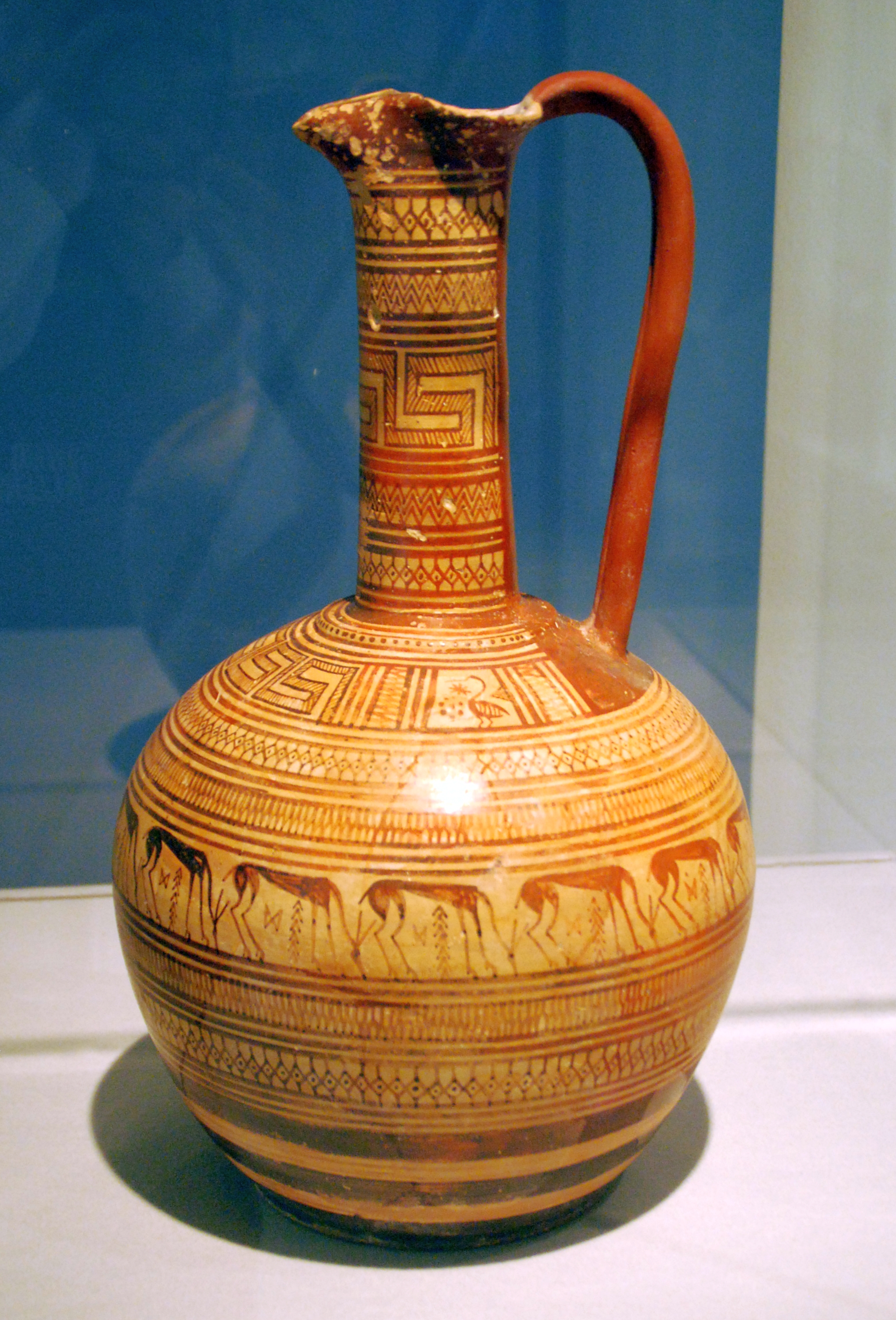 이후, 이집트, 아시리아, 시리아의 동방에서 가져온 공예품을 통해, 그리스 미술에서의 장식 모티프의 표현 영역이 크게 확대되었고, Palmette영어, 로터스, 로제트 등의 식물 문양이나 스핑크스 등의 공상 동물이 사용되었다. 프로토-코린토스식 도기나 코린토스식 도기 등, 이러한 장식 모티프를 이용하여 제작된 작품은 그리스 미술 중에서도 특히 동방화 양식이라고 칭하고, 구별하고 있다.
