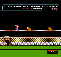 - 레벨 3: 트램펄린 사이를 점프하고 칼 던지는 사람과 불뿜는 사람을 조심한다. 하위 레벨 3과 6에서는 트램펄린이 수영장에 설치되고 칼 던지는 사람과 불뿜는 사람이 점프하는 돌고래로 대체된다. 이 레벨은 MSX와 패미컴/NES 버전에는 없다.