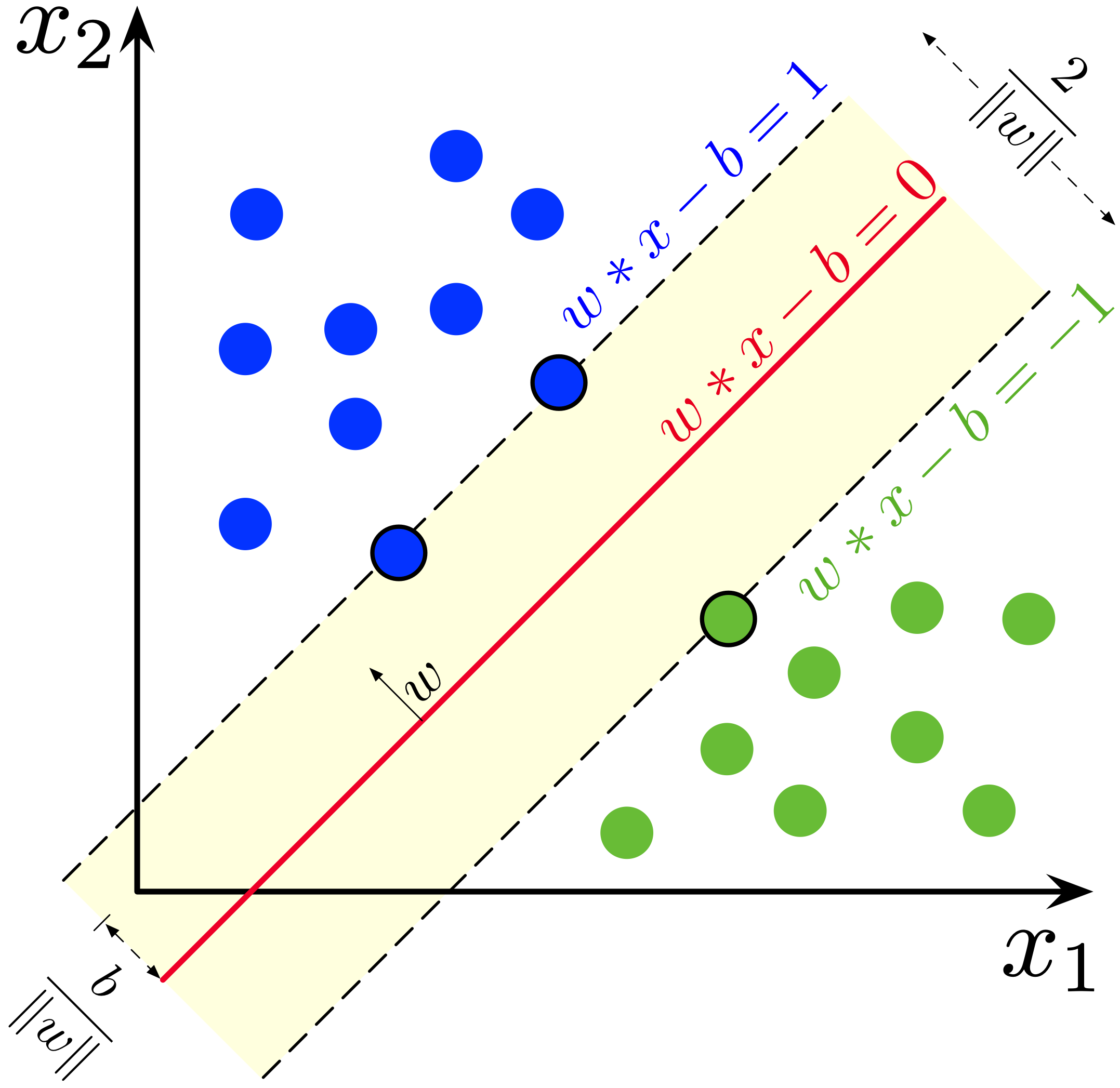 기하학적으로, 이 두 초평면 사이의 거리는 이다.[19] 따라서 평면 사이의 거리를 최대화하려면 를 최소화해야 한다. 거리는 점과 평면 사이의 거리 방정식을 사용하여 계산된다. 또한 데이터 포인트가 마진에 들어가는 것을 방지해야 하므로 다음과 같은 제약 조건을 추가한다. 각 에 대해