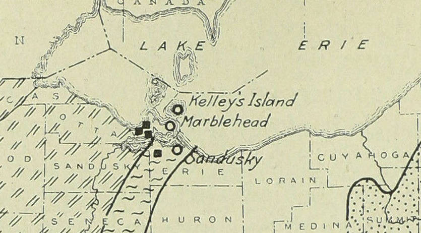 1923년 "오하이오 지리"에서 발췌한 오하이오 북부 석고 매장 지도(검은색 정사각형은 매장 위치 표시)