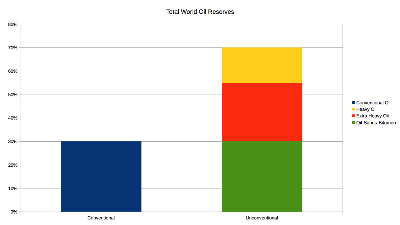 미국 지질 조사소(USGS)는 서반구의 비전통 석유 자원이 중동의 전통적인 원유 확인 매장량과 거의 같다고 추정한다.[62] 자원 전문가들은 세계의 궁극적인 비전통 석유 매장량이 전통적인 석유 매장량보다 몇 배나 크며, 21세기에 더 높은 가격으로 인해 회사에 매우 수익성이 높을 것이라고 믿고 있다.[63] 2009년 10월, 미국 지질 조사소(USGS)는 오리노코 타르 샌드(베네수엘라)의 회수 가능한 "평균값"을 513Goilbbl로 업데이트했으며, 90% 확률로 380-652Goilbbl 범위 내에 있을 것으로 예상하여 이 지역을 "세계에서 가장 큰 회수 가능한 석유 축적 지역 중 하나"로 만들었다.[33]
