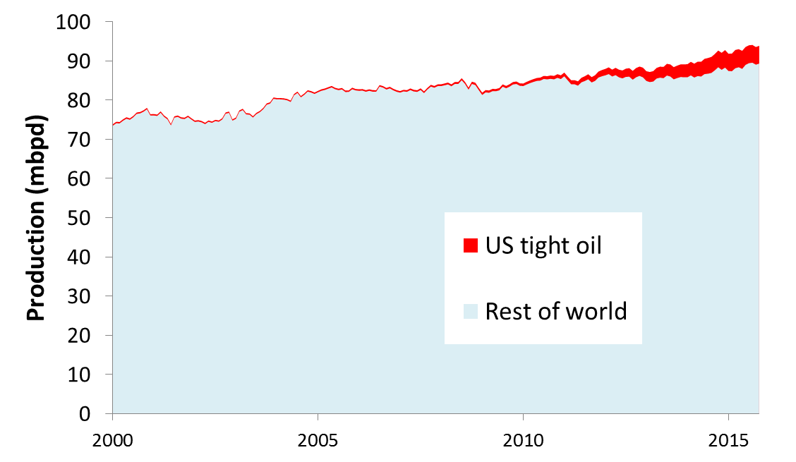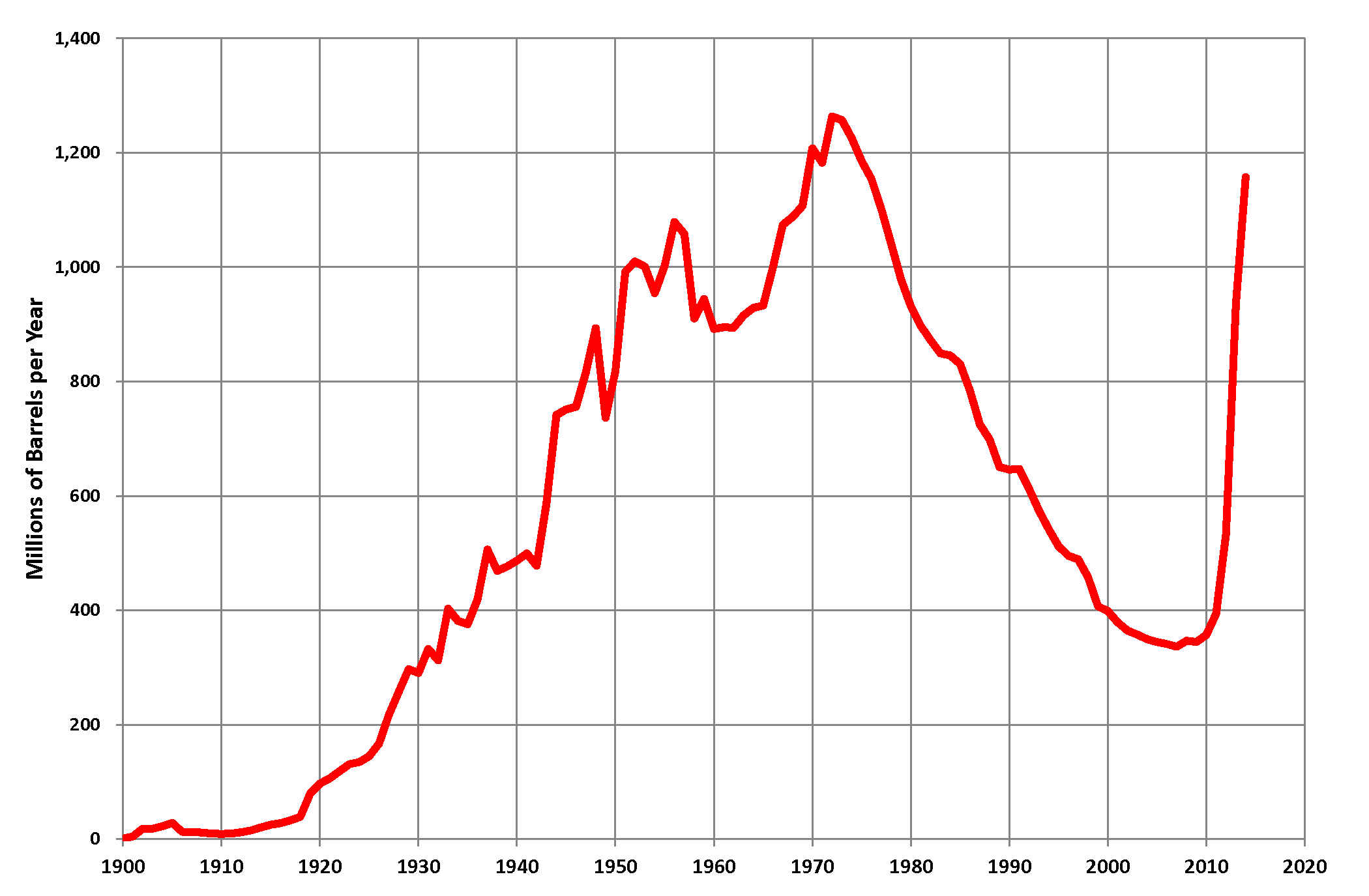 전통적 석유는 2000년 이전에 일반적으로 사용되던 기술을 사용하여 추출되는 석유를 말한다.[20] 이는 주로 육상 유전 및 얕은 해상 유전에서 "쉽게" 추출할 수 있는 석유를 지칭한다.전통적 석유 생산은 2005~2006년경에 정점에 도달한 것으로 알려져 있다.[21][22] 그 이후 석유 생산 정점을 막아온 것은 2008년 세계 금융 위기 이후 급증한 미국의 타이트 오일 생산이다.[23] 또한, 캐나다의 오일 샌드 생산도 2008년 이후 석유 공급 증가에 기여했다.[24]