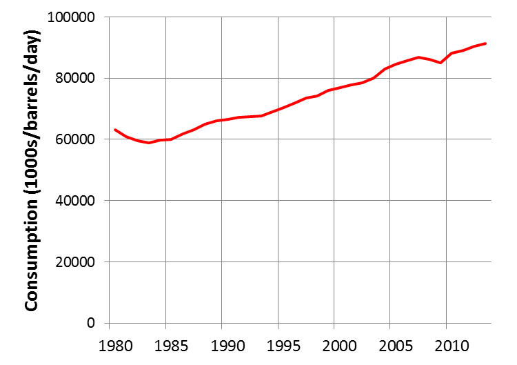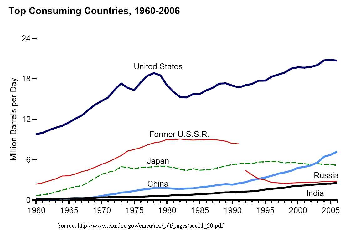 개발도상국의 석유 수요가 빠르게 증가하고 있지만,[178] 원유를 가장 많이 소비하는 나라는 미국이다. 1995년과 2005년 사이, 미국의 석유 소비는 하루에 에서 로 약 증가했다. 반면 중국은 같은 기간동안 하루에 에서 로 증가했다.[179]
