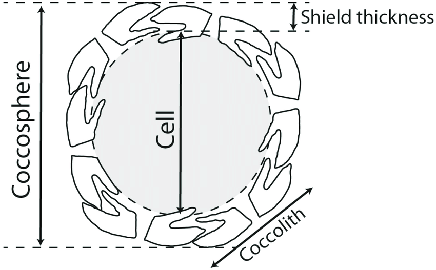 석회비늘편모류는 크기 5~100 마이크로미터의 원형 세포로, 코콜리드라고 부르는, 크기 2~25 마이크로미터의 석회질 판으로 둘러싸여 있다.[155] 코콜리드로 이루어진 전체 구조는 코코스피어라고 부른다.